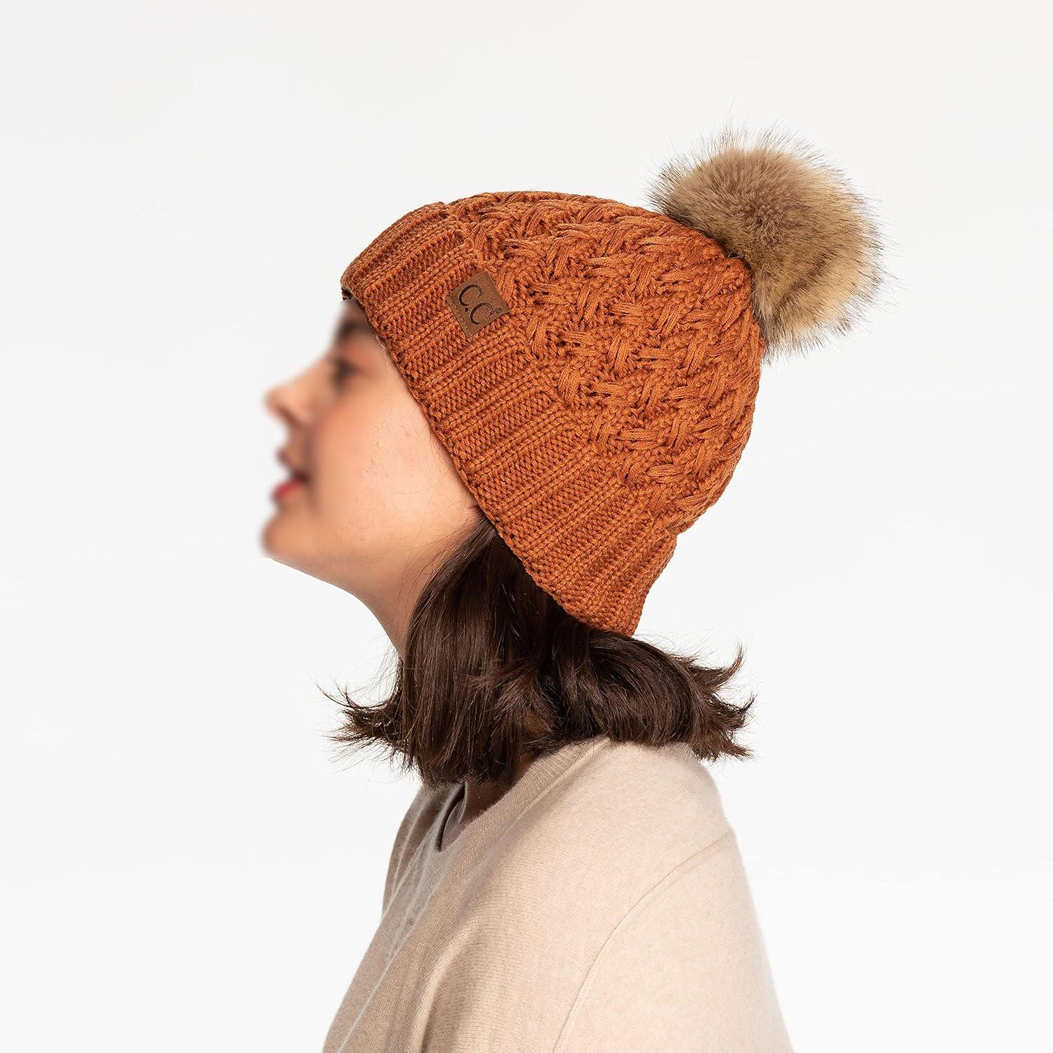 C.C Exclusives Fuzzy Lined Knit Fur Pom Beanie Hat (YJ-820)(A Lattice Crossover Stitch-clay)