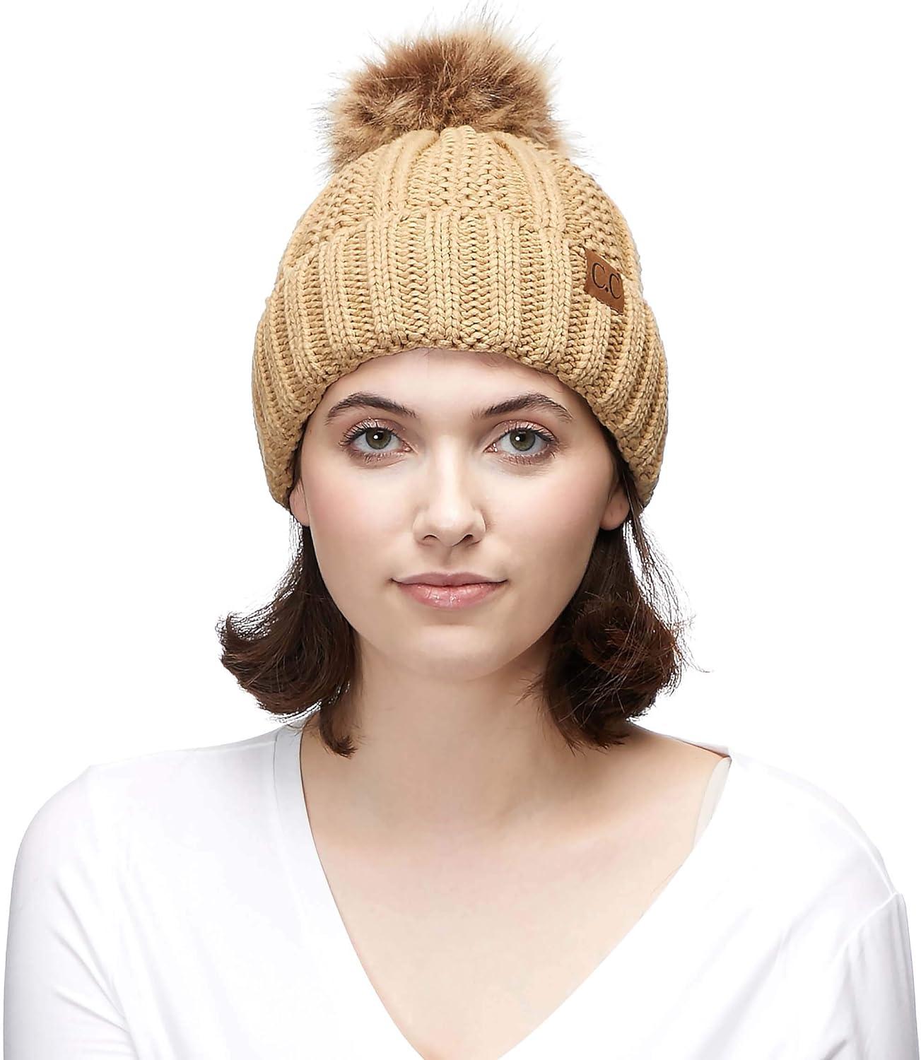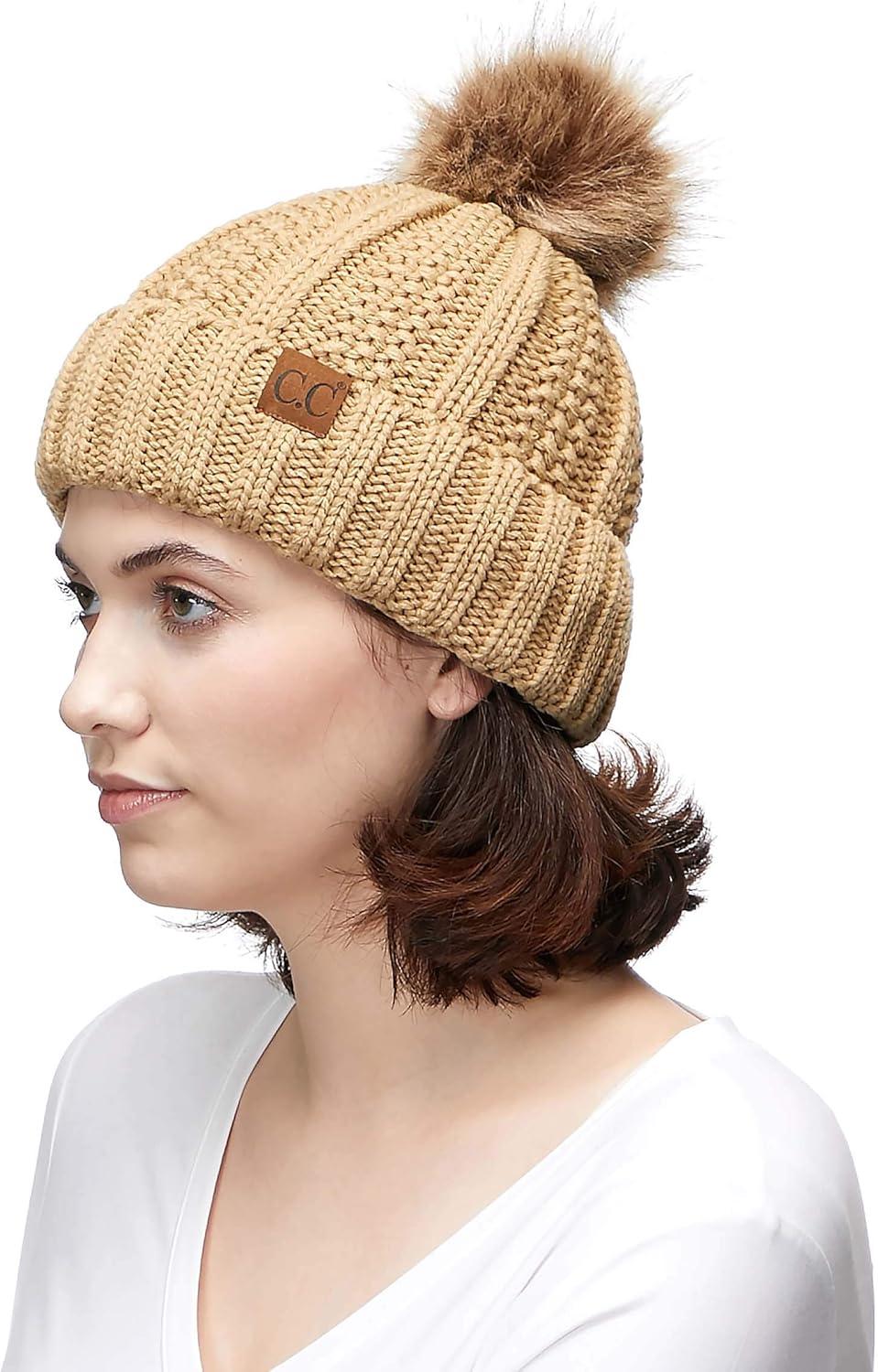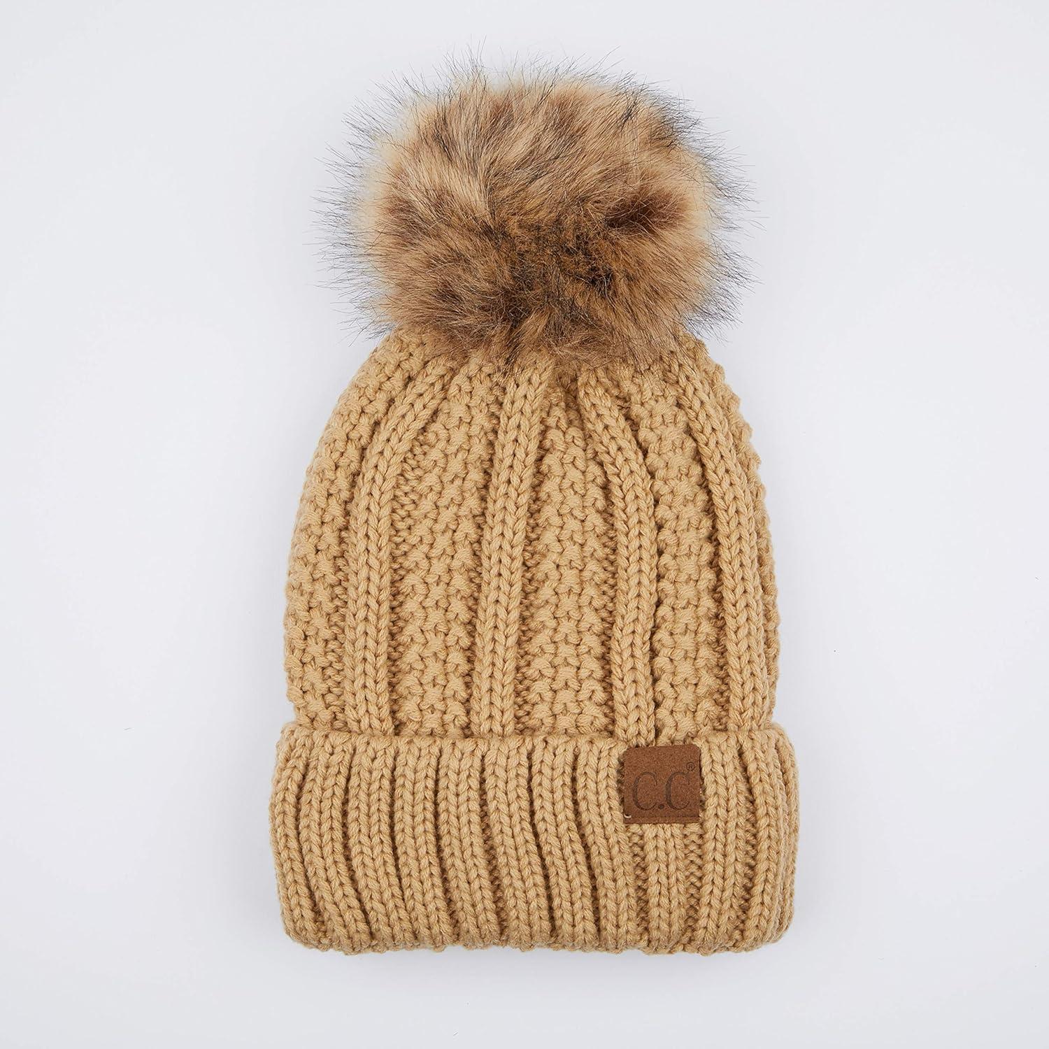 C.C Exclusives Fuzzy Lined Knit Fur Pom Beanie Hat (YJ-820)(Camel)
