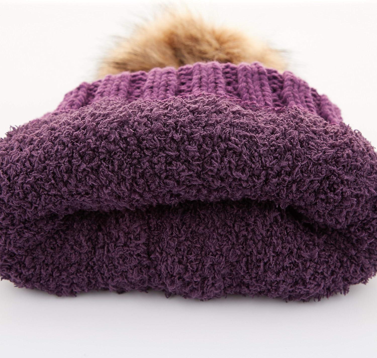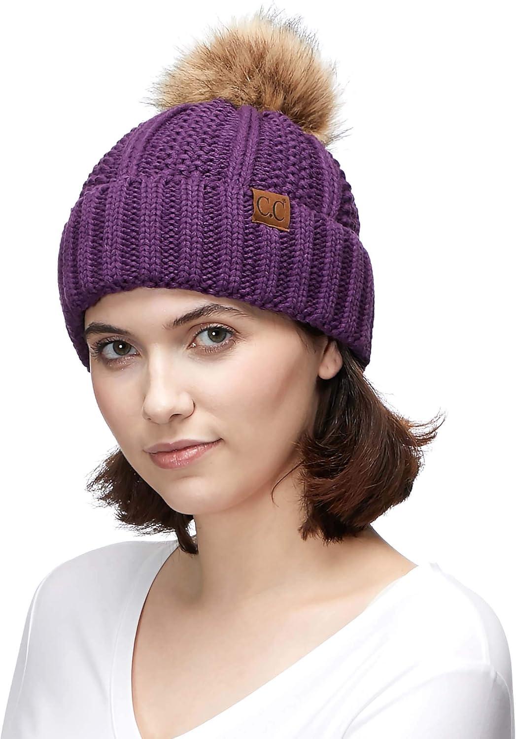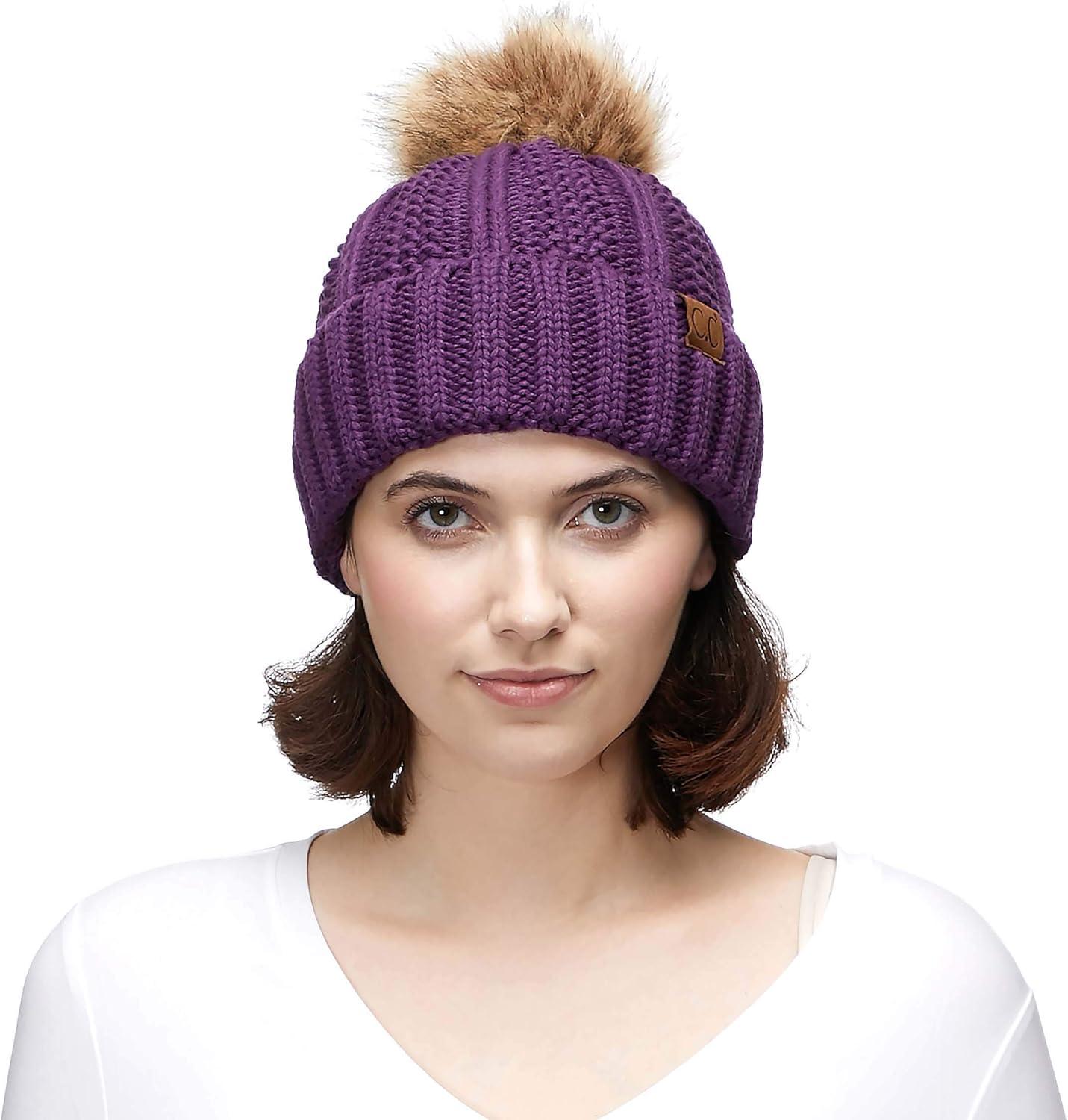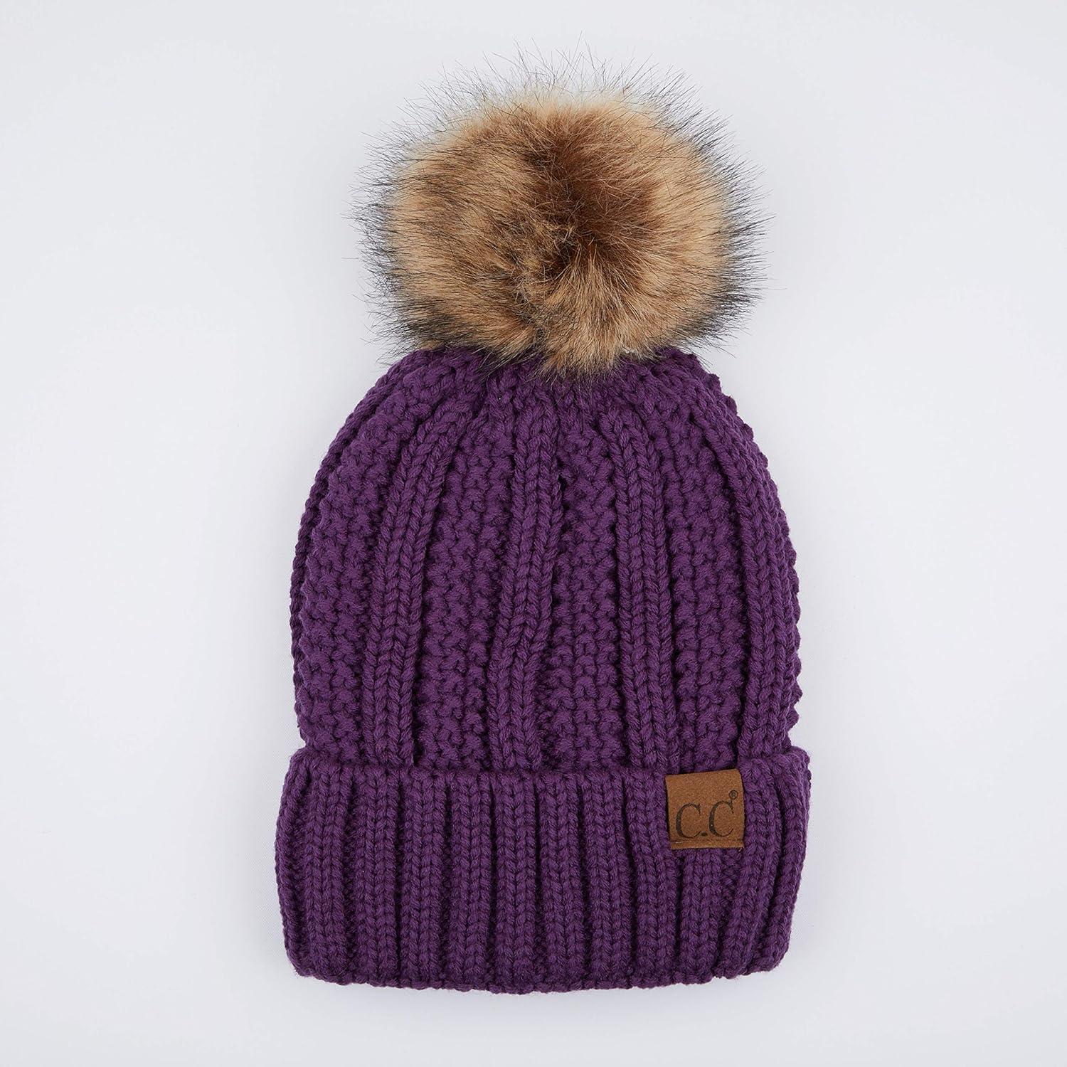 C.C Exclusives Fuzzy Lined Knit Fur Pom Beanie Hat (YJ-820)(Purple)