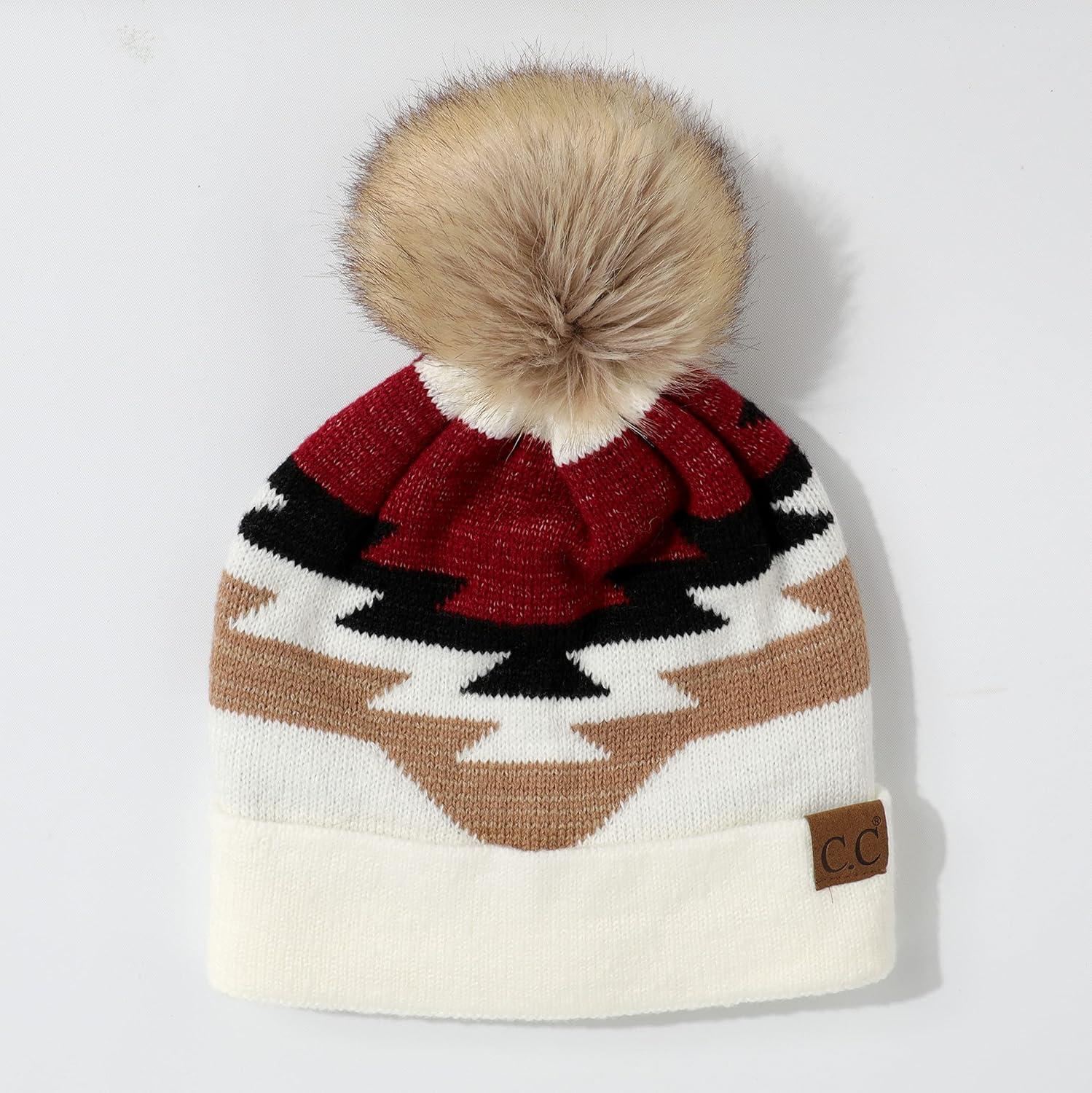 C.C Exclusives Plush Yarn Pom Beanie hat with Daisy Pattern (HAT-2093)(HAT-3001)(HAT-4005)(HAT-4009)(HAT-4023)(Aztec Pattern-black)