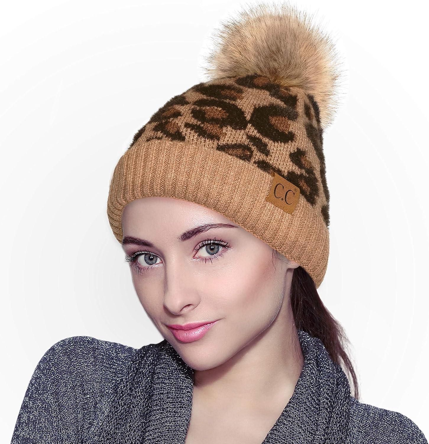 C.C Exclusives Soft Beanie hat with Leopard Pattern and Fur Pom(HAT-7001)(SF-7001)(Latte-leo)