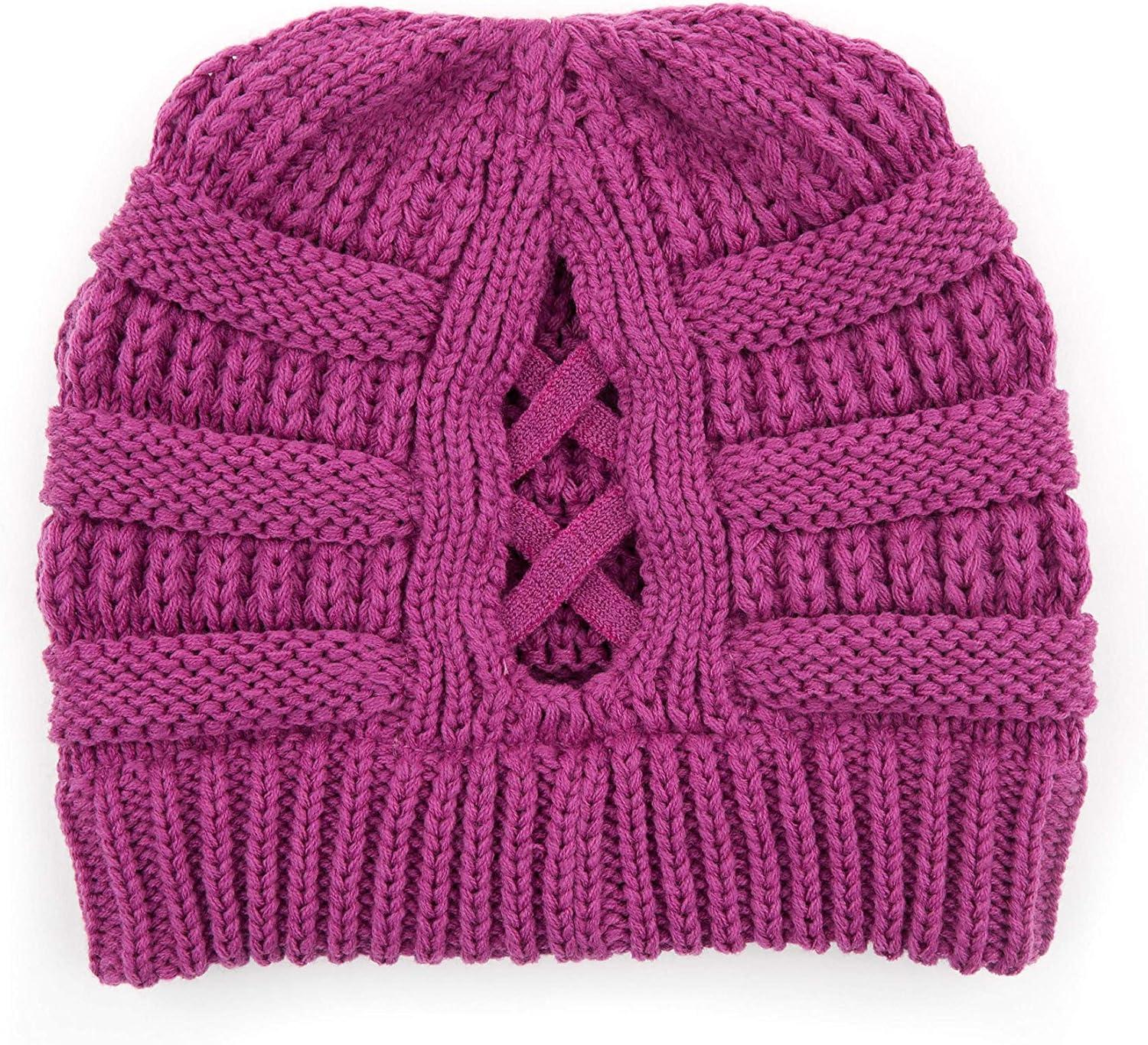 C.C Exclusives Soft Stretch Cable Knit Messy Bun Ponytail Beanie Winter Hat for Women (MB-20A)(0 Criss-cross Magenta Purple)