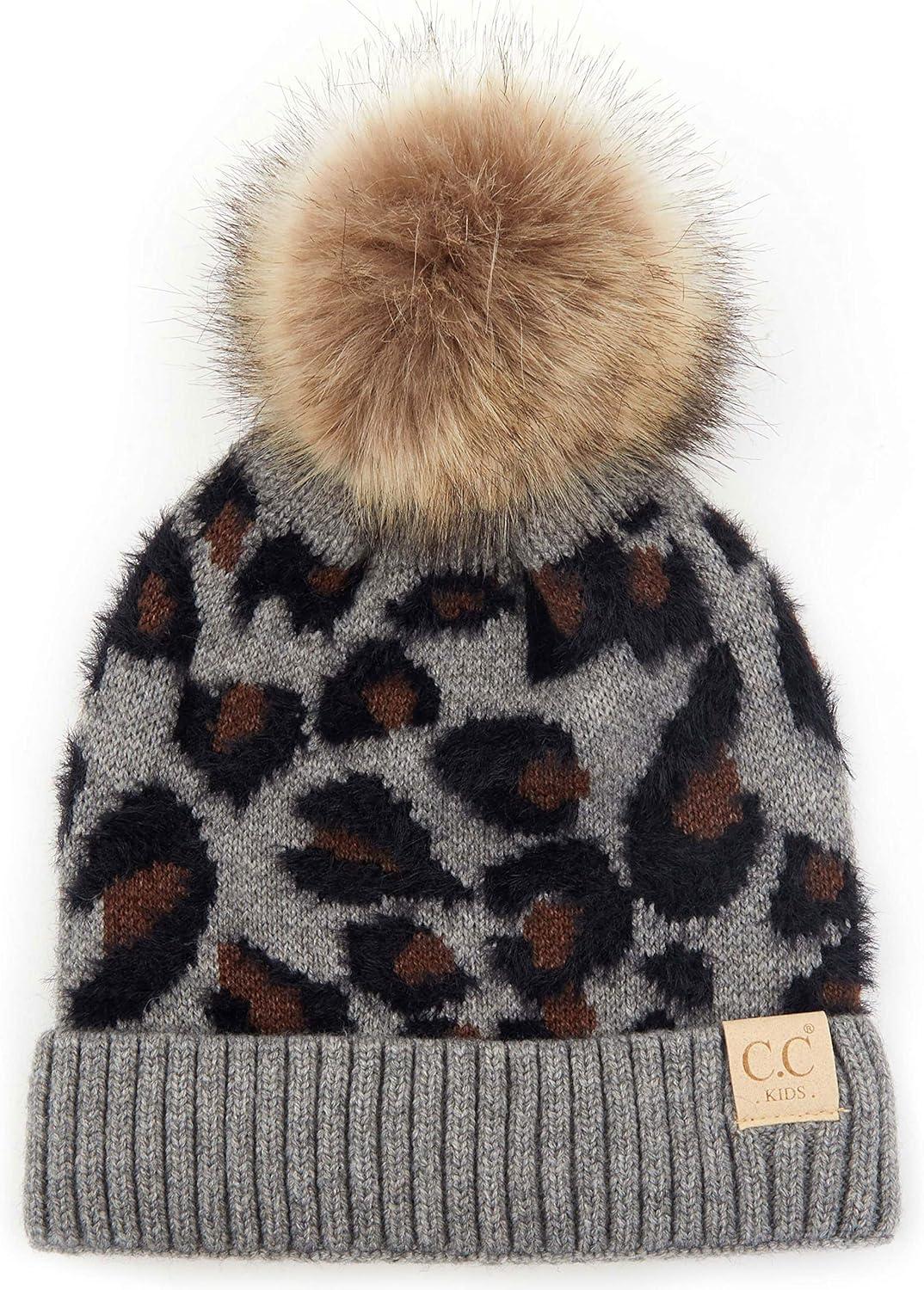 C.C Exclusives Solid Ribbed Kids Beanie Hat with Faux Fur Pom (KIDS-43)(KIDS-2061)(Leopard-lt Mel Grey)
