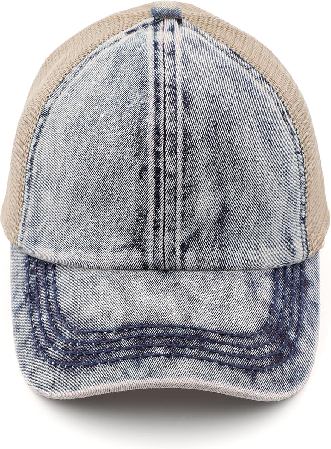 C.C Exclusives Washed Distressed Cotton Denim Criss-Cross Ponytail Hat Baseball Cap (BT-1009)(Denim)