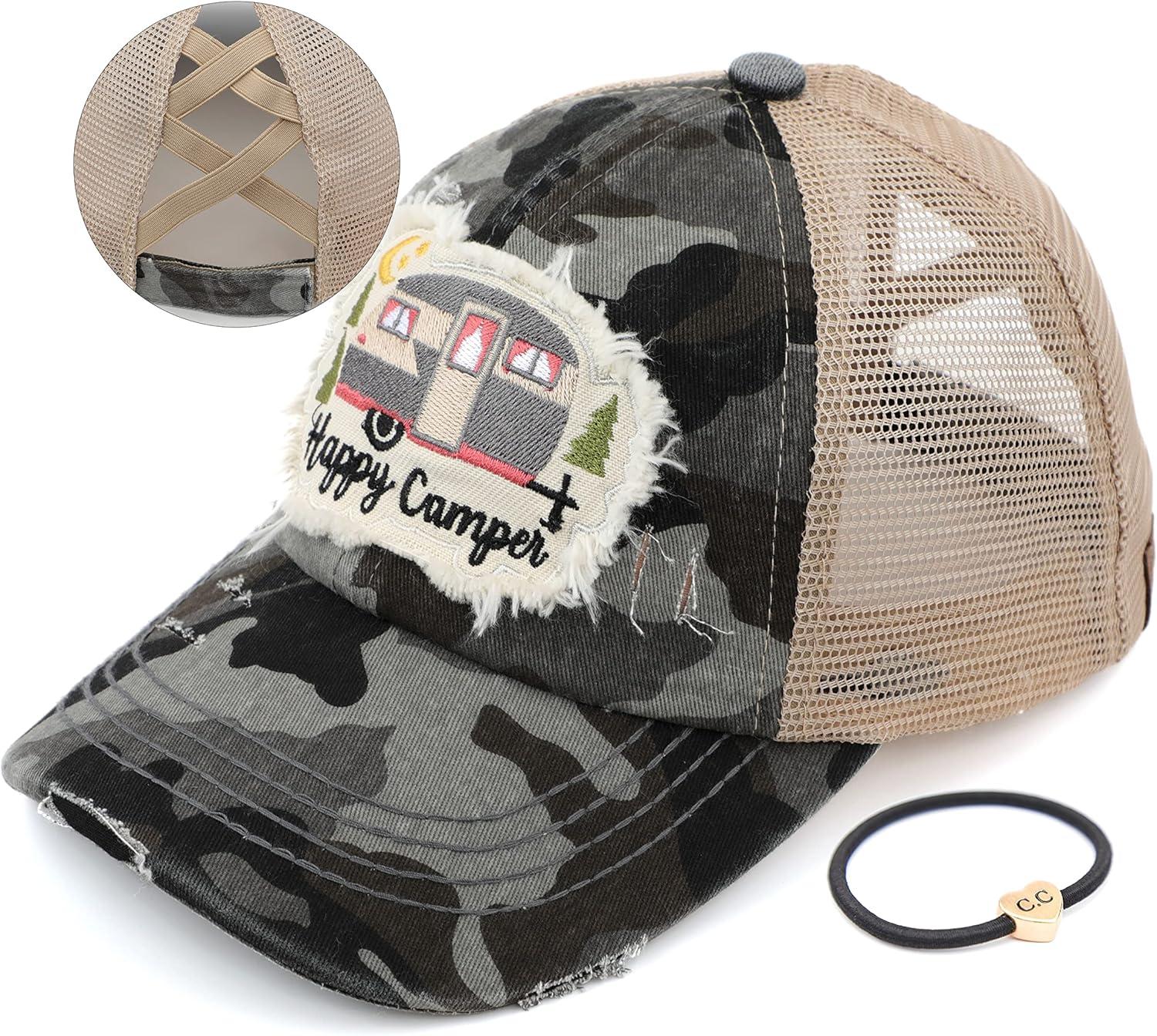 C.C Exclusives Washed Distressed Embroidered Patch Cotton Denim Criss-Cross Ponytail Hat Adjustable Baseball Cap(Happy Camper – Grey Camo)