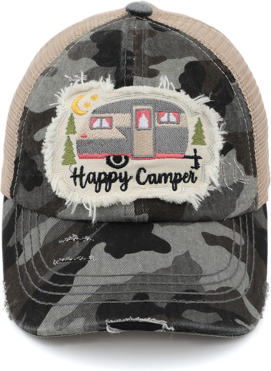 C.C Exclusives Washed Distressed Embroidered Patch Cotton Denim Criss-Cross Ponytail Hat Adjustable Baseball Cap(Happy Camper - Grey Camo)