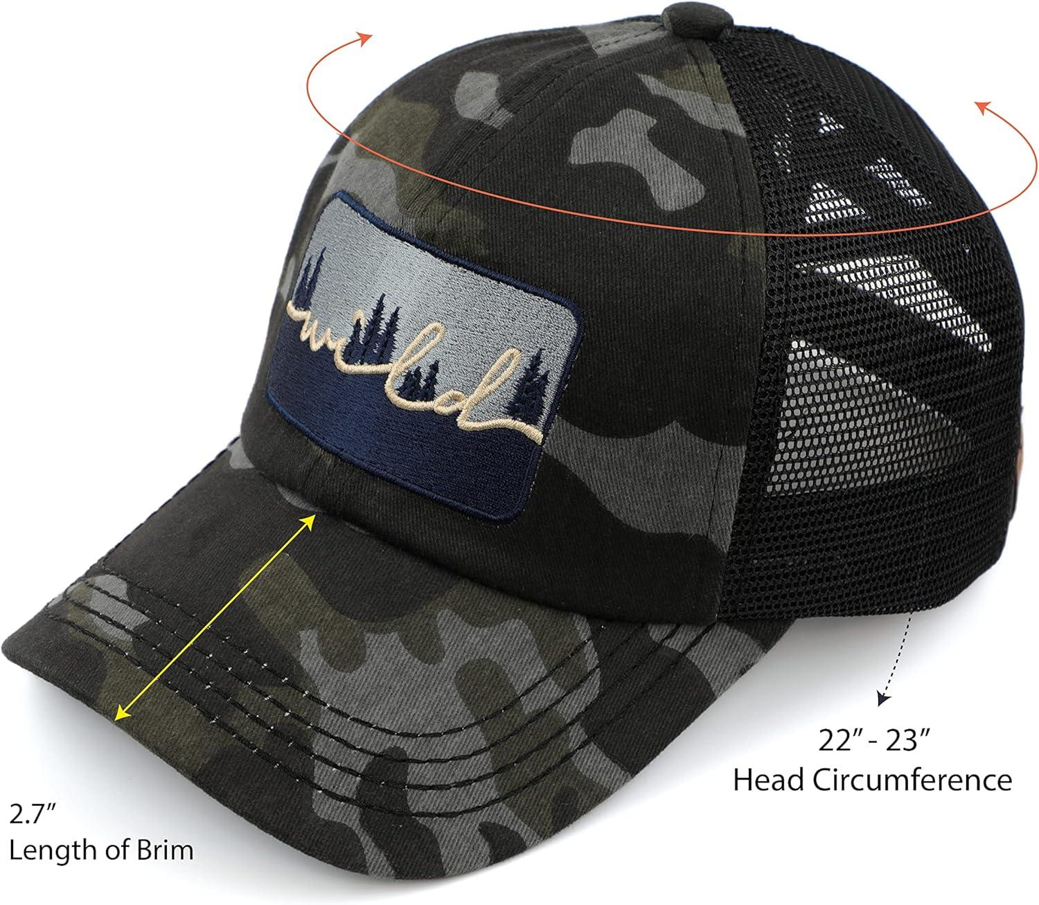 C.C Exclusives Washed Distressed Embroidered Patch Cotton Denim Criss-Cross Ponytail Hat Adjustable Baseball Cap(Wild – Black Camo)