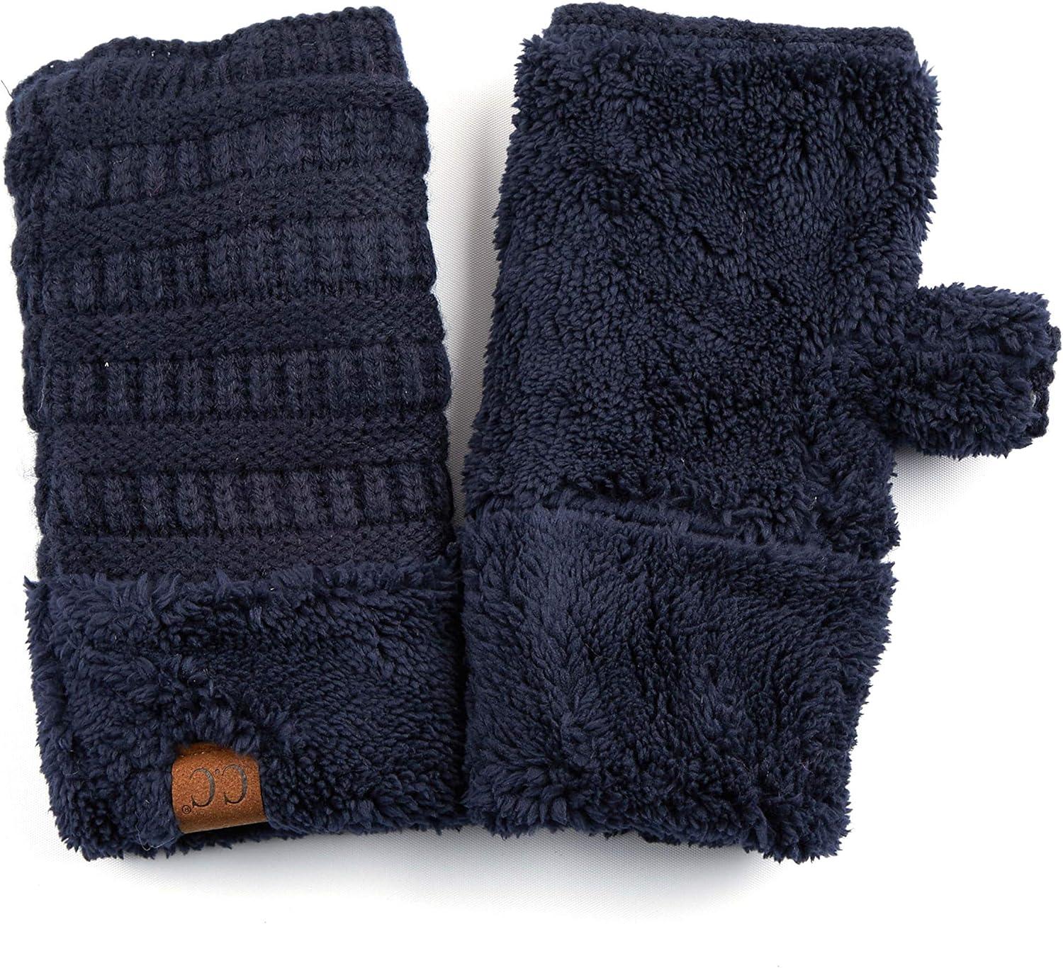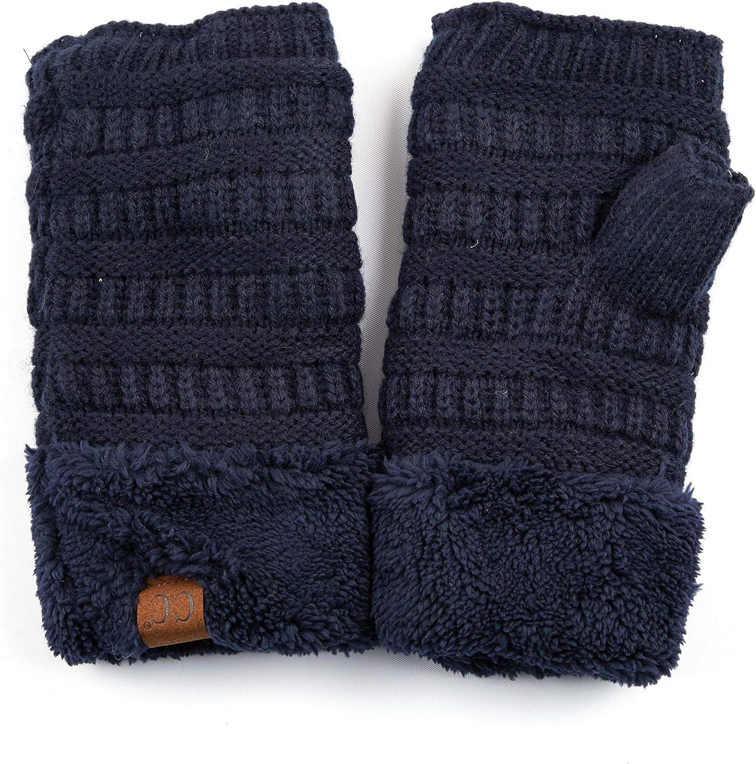 C.C Fingerless Gloves for Women – Fuzzy Lined Knit Wrist Warmers, Ribbed Smocking Stitch, Soft Acrylic (FLG-25)(Navy)