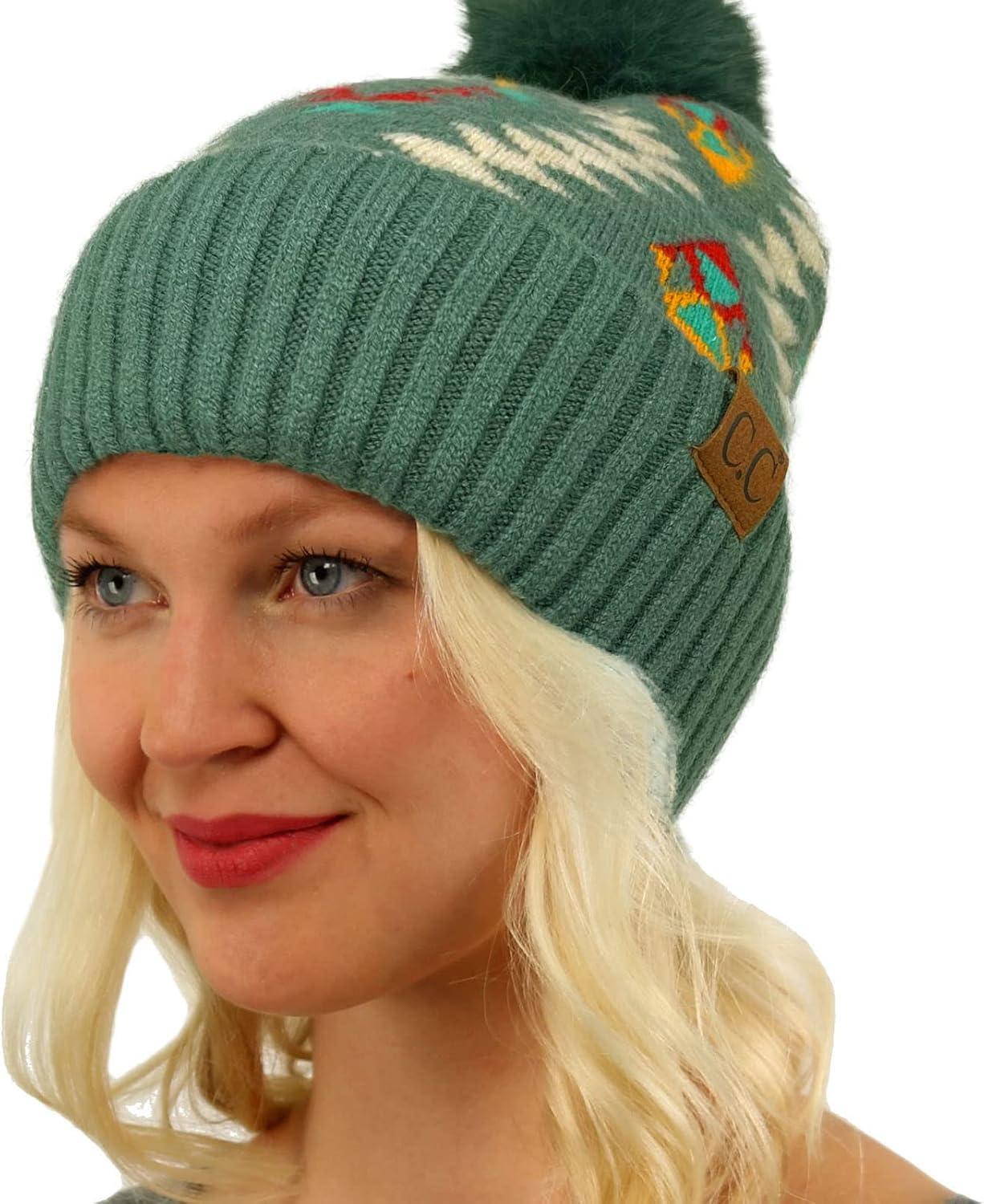 C.C Fur Pom Winter Fall Trendy Chunky Stretchy Cable Knit Beanie Hat(Aztec Forest Green)