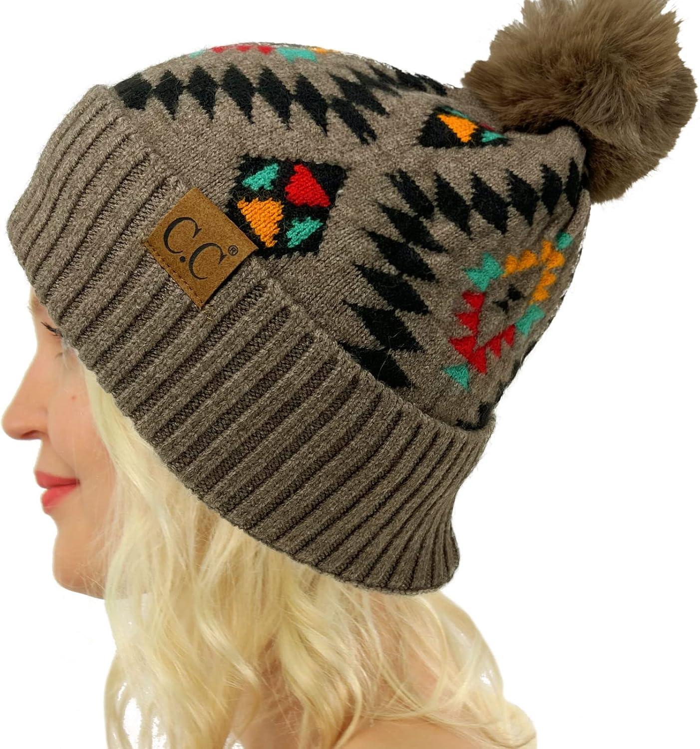 C.C Fur Pom Winter Fall Trendy Chunky Stretchy Cable Knit Beanie Hat(Aztec Taupe)