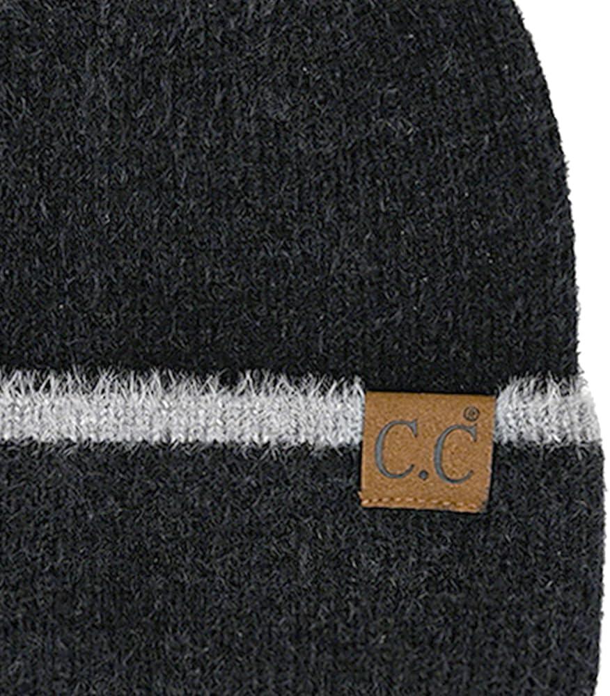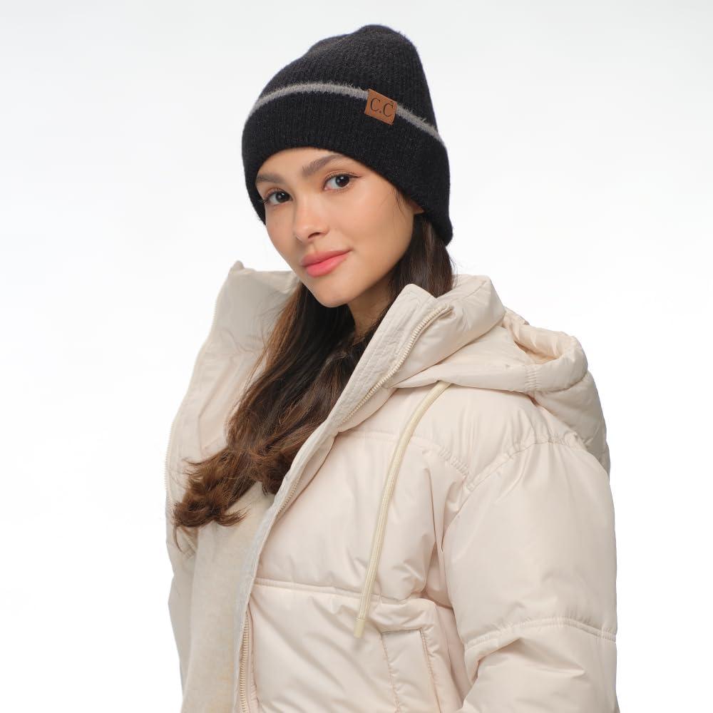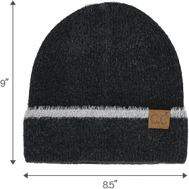 C.C Fuzzy Beanie for Women Unisex - Acrylic Stretchable Soft Warm Knit Winter Skully Hat(Feather Yarn-black)