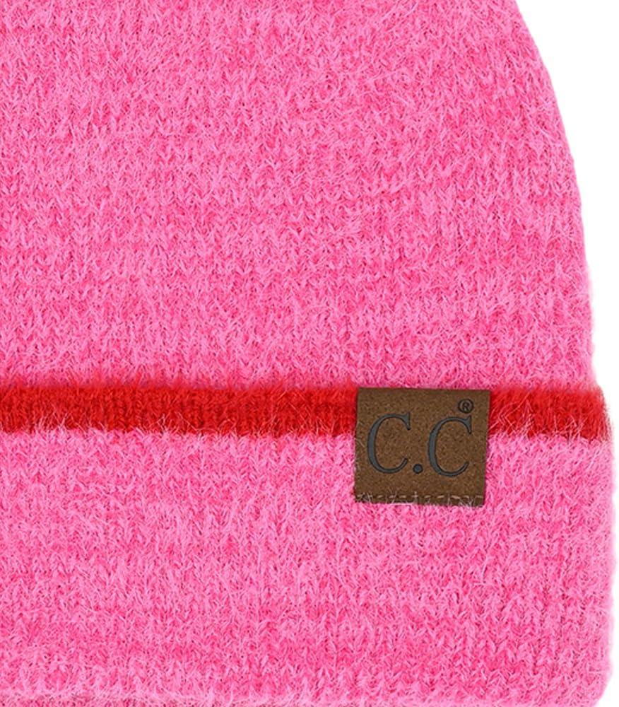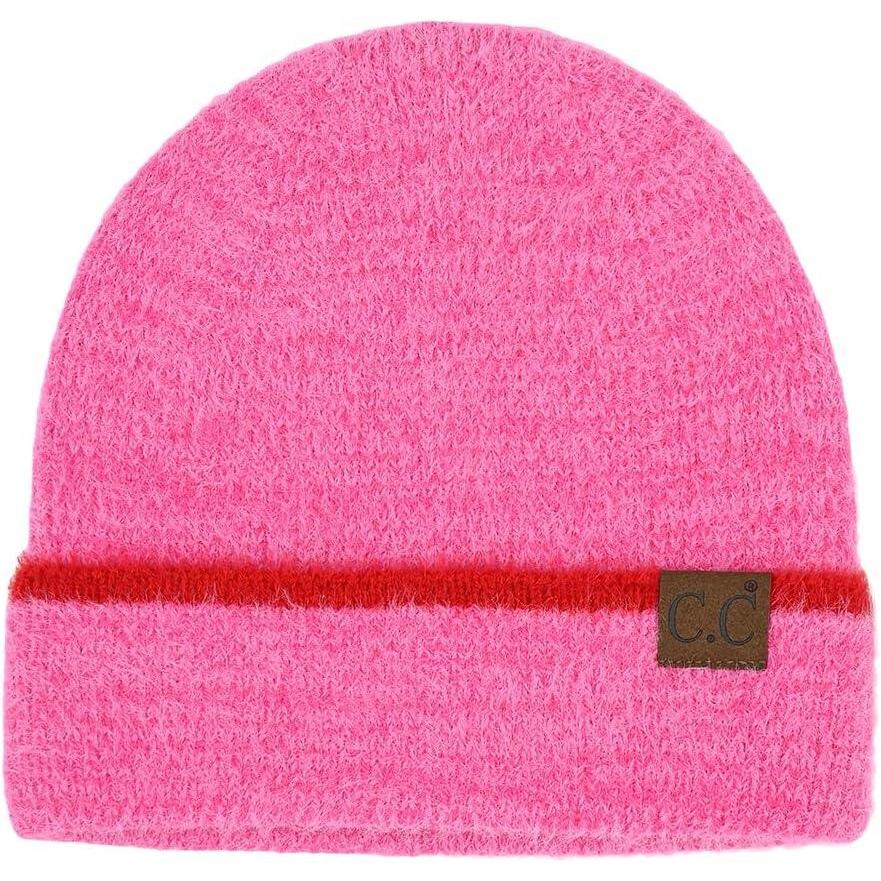 C.C Fuzzy Beanie for Women Unisex - Acrylic Stretchable Soft Warm Knit Winter Skully Hat(Feather Yarn-hot Pink)