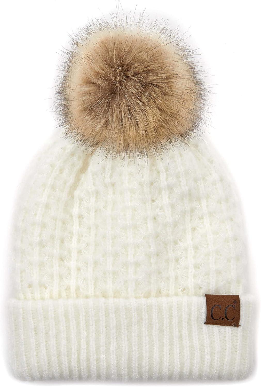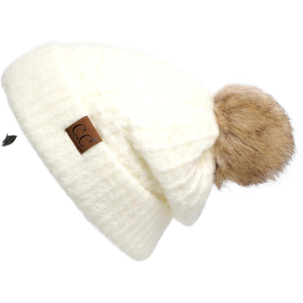 C.C Hatsandscarf Exclusives Unisex Solid Ribbed Beanie with Pom (HAT-43)(A Smocking Stitch Pattern-ivory)