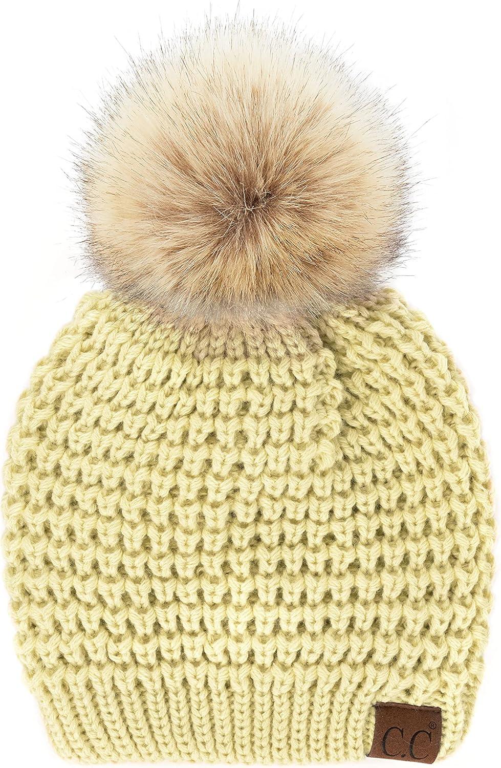 C.C Hatsandscarf Exclusives Unisex Solid Ribbed Beanie with Pom (HAT-43)(A Waffle Stitch Pattern-lemonade)