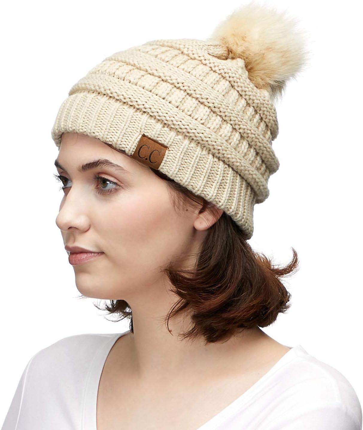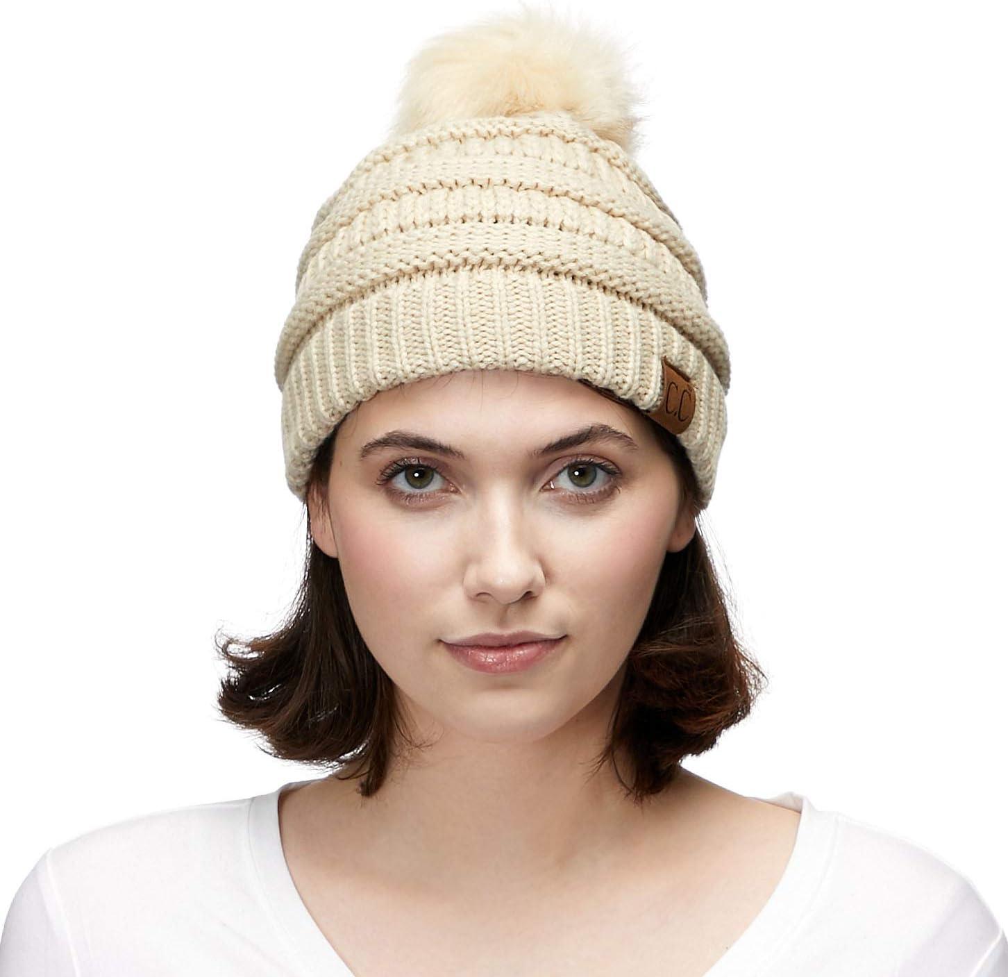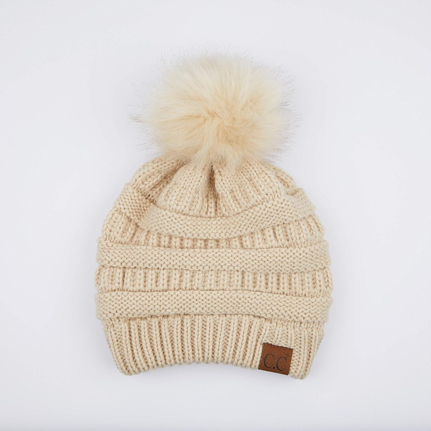 C.C Hatsandscarf Exclusives Unisex Solid Ribbed Beanie with Pom (HAT-43)(Beige Pom)