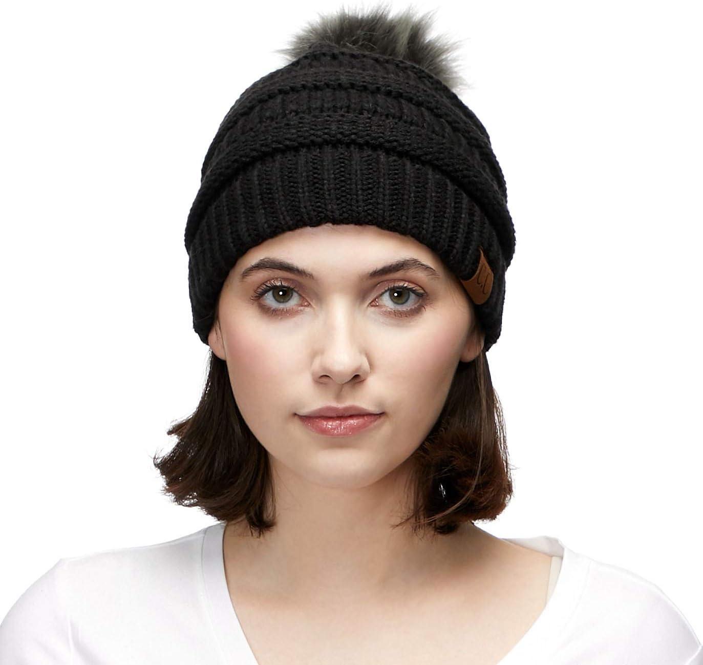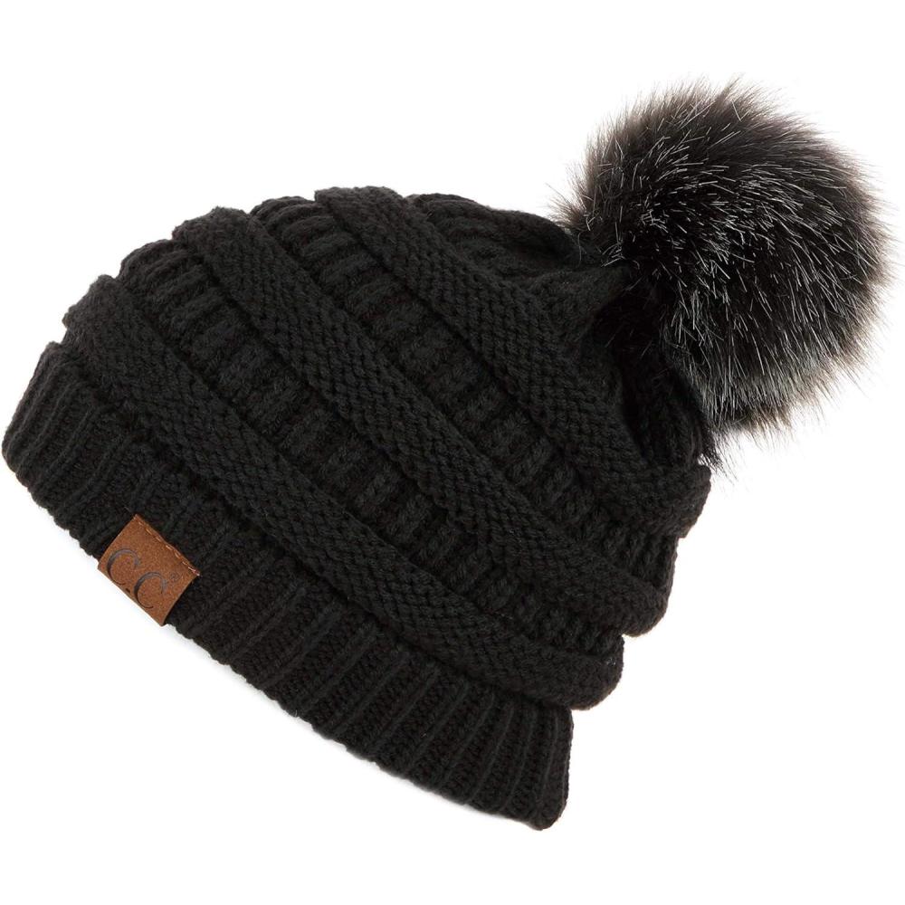 C.C Hatsandscarf Exclusives Unisex Solid Ribbed Beanie with Pom (HAT-43)(Black / Grey Pom)