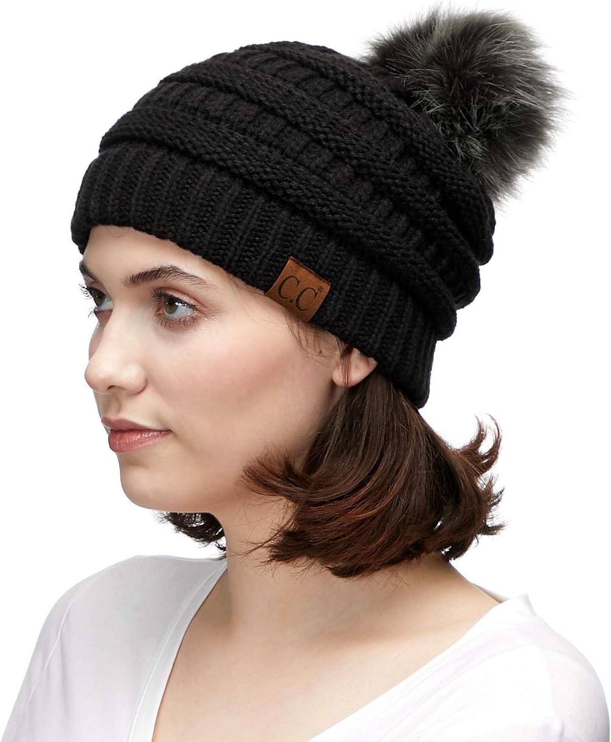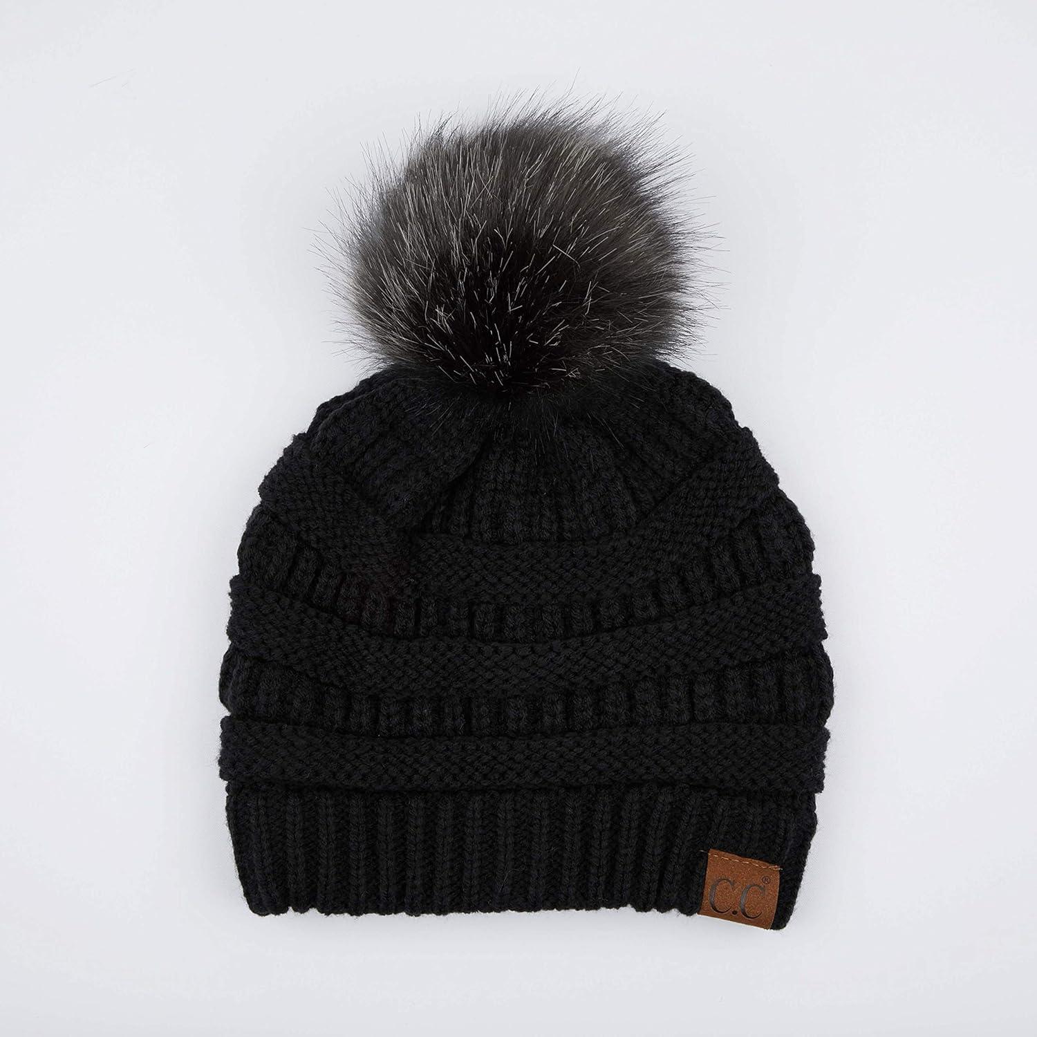 imageCC Hatsandscarf Exclusives Unisex Solid Ribbed Beanie with Pom HAT43Black  Grey Pom