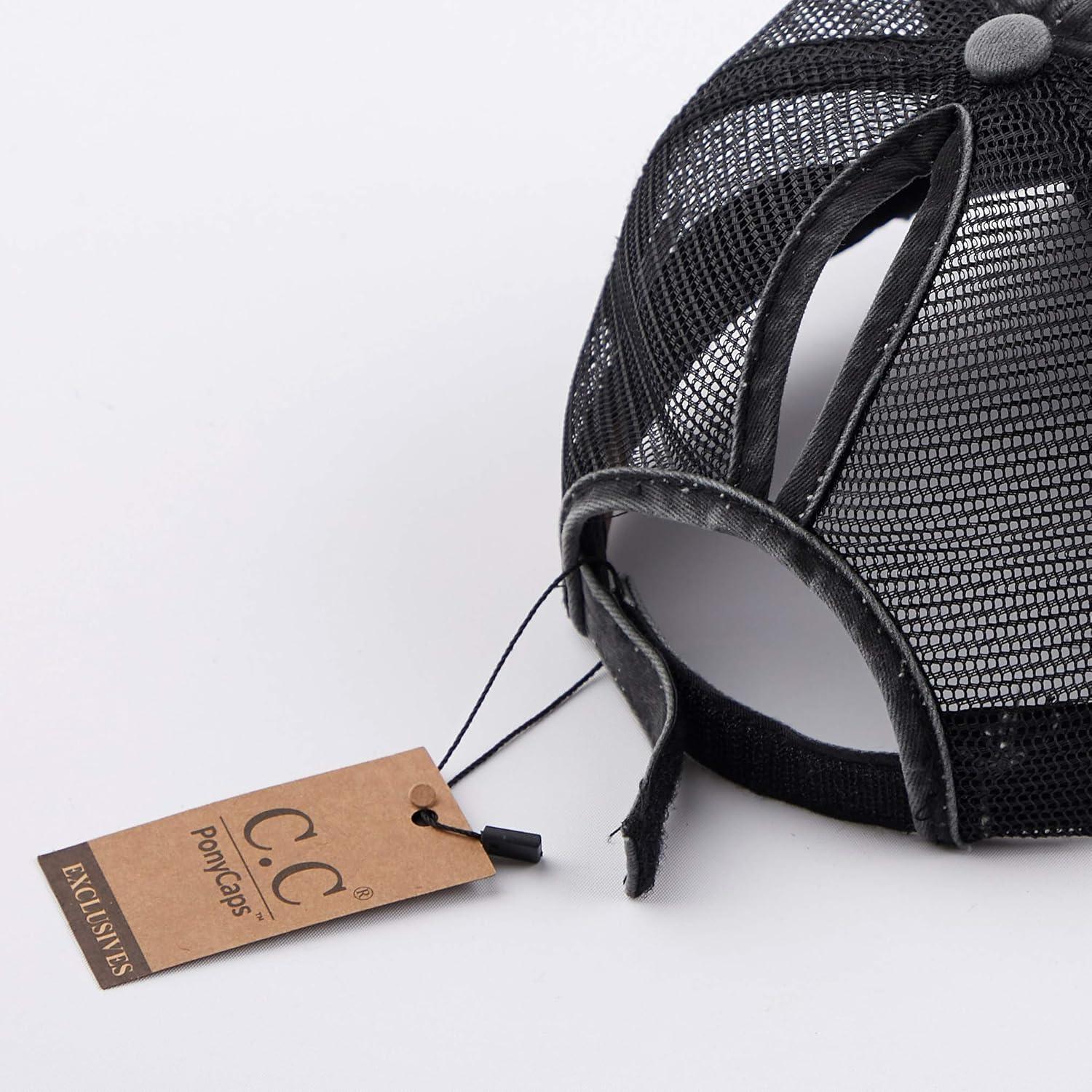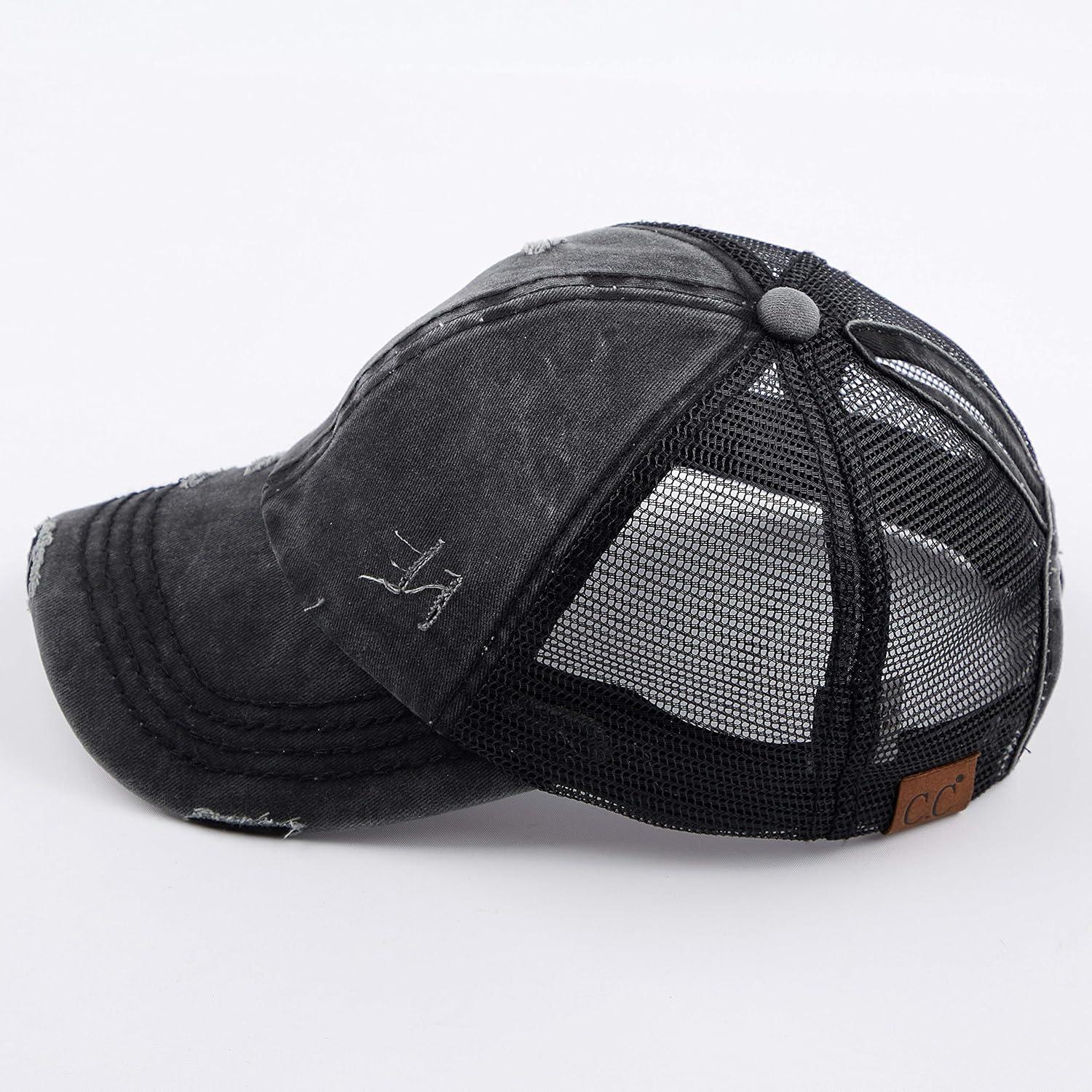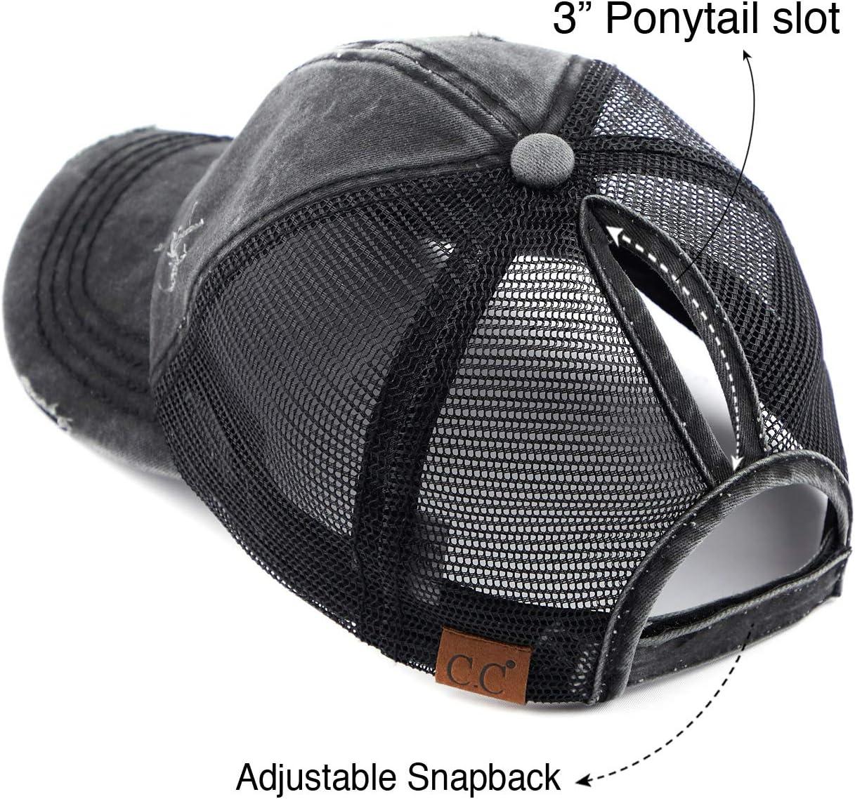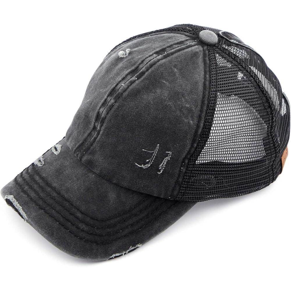 C.C Hatsandscarf Exclusives Washed Distressed Cotton Denim Ponytail Hat Adjustable Baseball Cap (BT-12) (BT-13)(All Black)