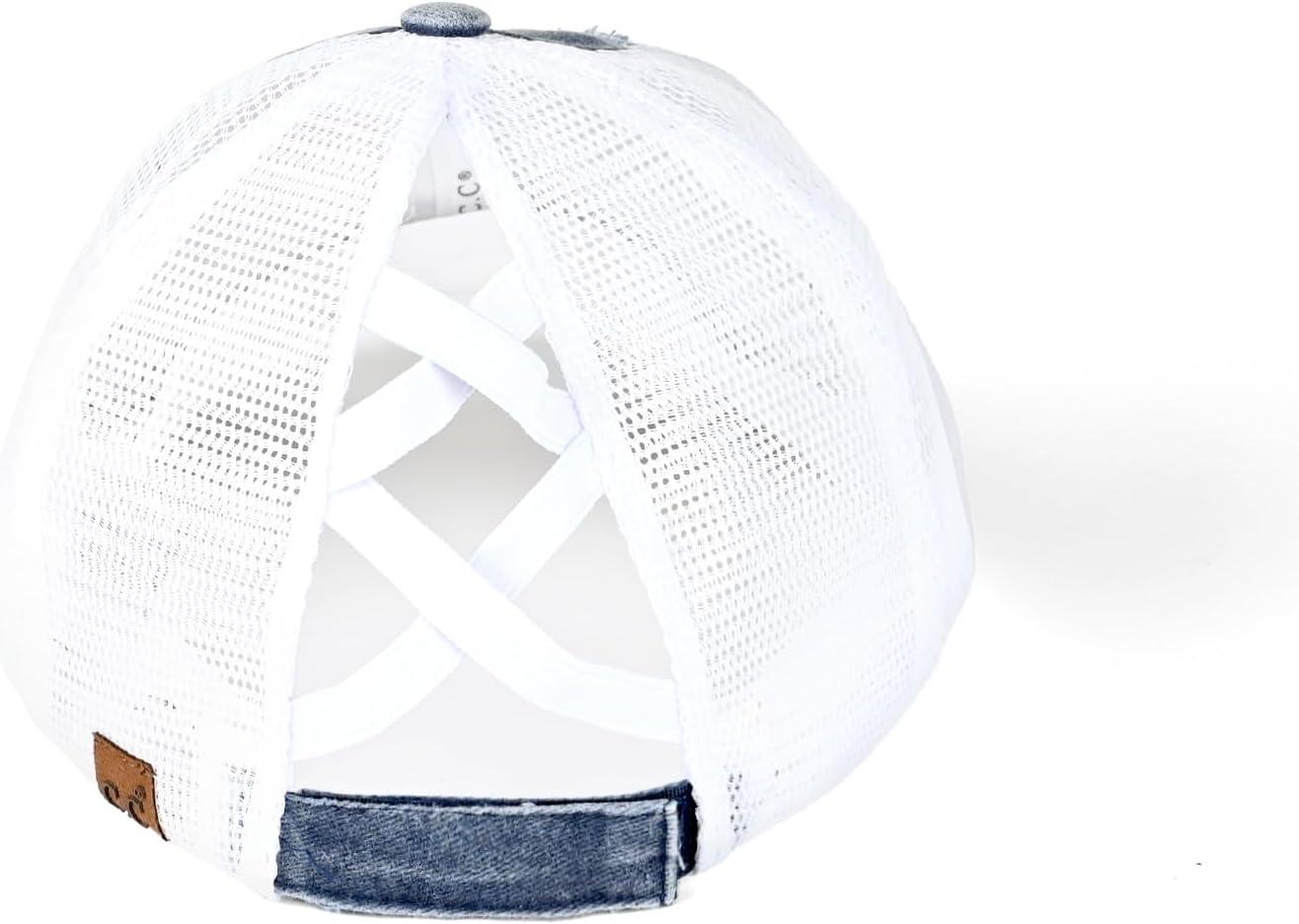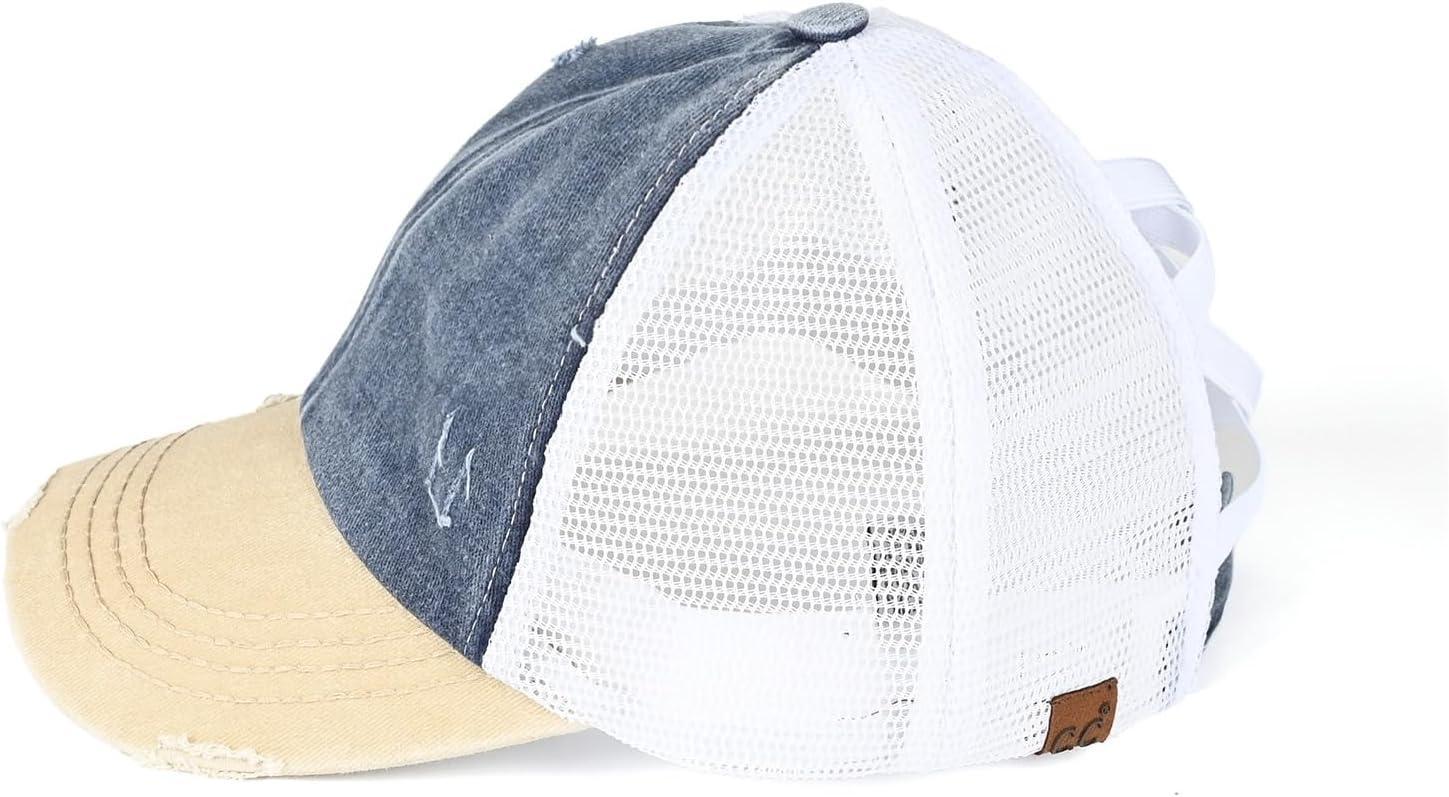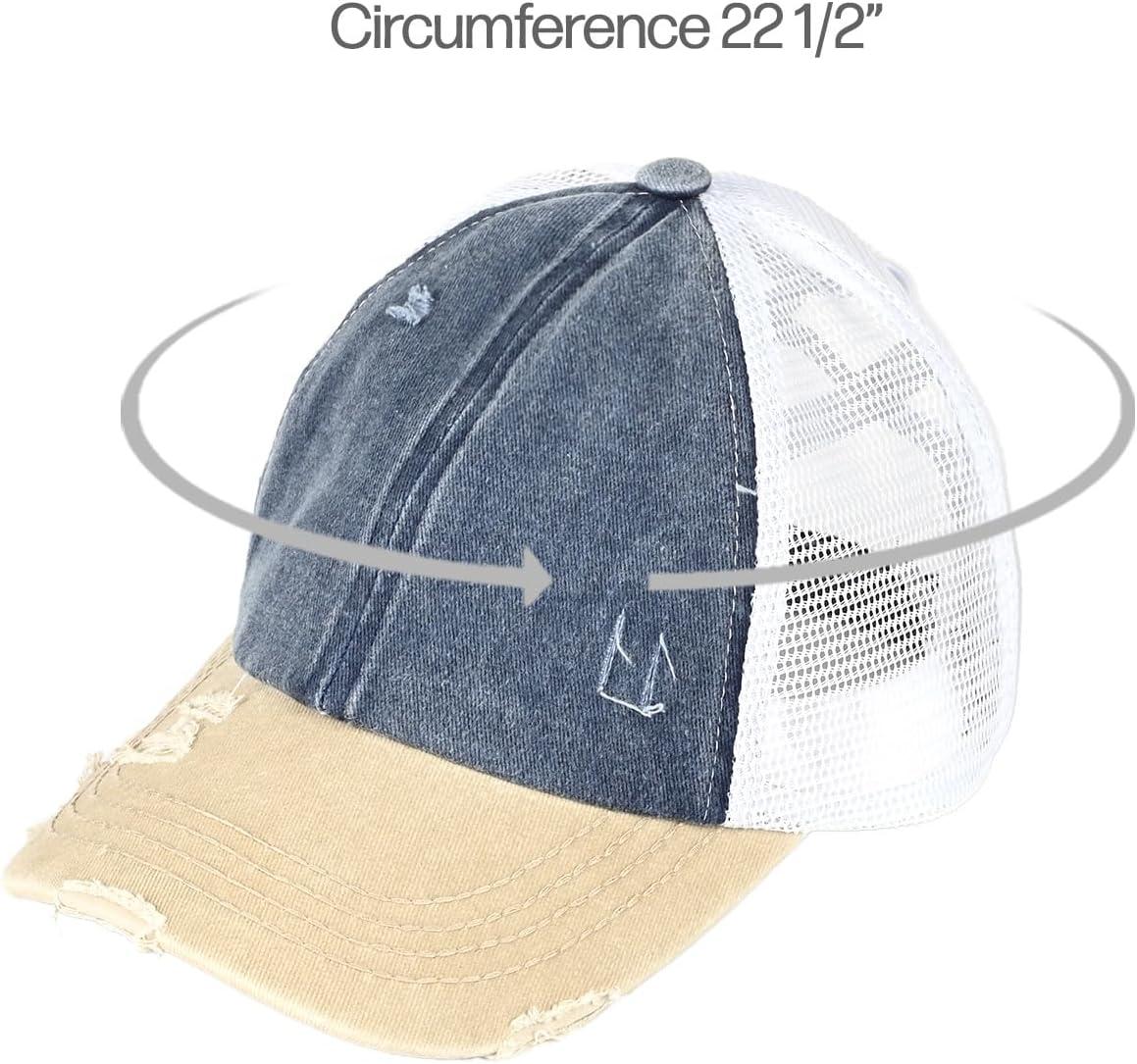 C.C Hatsandscarf Exclusives Washed Distressed Cotton Denim Ponytail Hat Adjustable Baseball Cap (BT-12) (BT-13)(Navy/Beige)