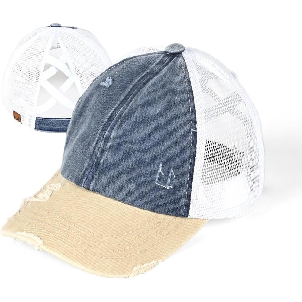 Save big on C.C Hatsandscarf Exclusives Washed Distressed Cotton Denim Ponytail Hat Adjustable Baseball Cap (BT-12) (BT-13)(Navy/Beige) and accessories during our BOGO sale. Buy one, get one 50% off!