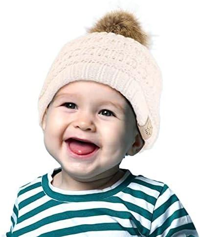 C.C Kids’ Babies’ Soft Stretch Cable Knit Faux Fur Pom Pom Beanie Hat(Leopard Light Melange Gray)