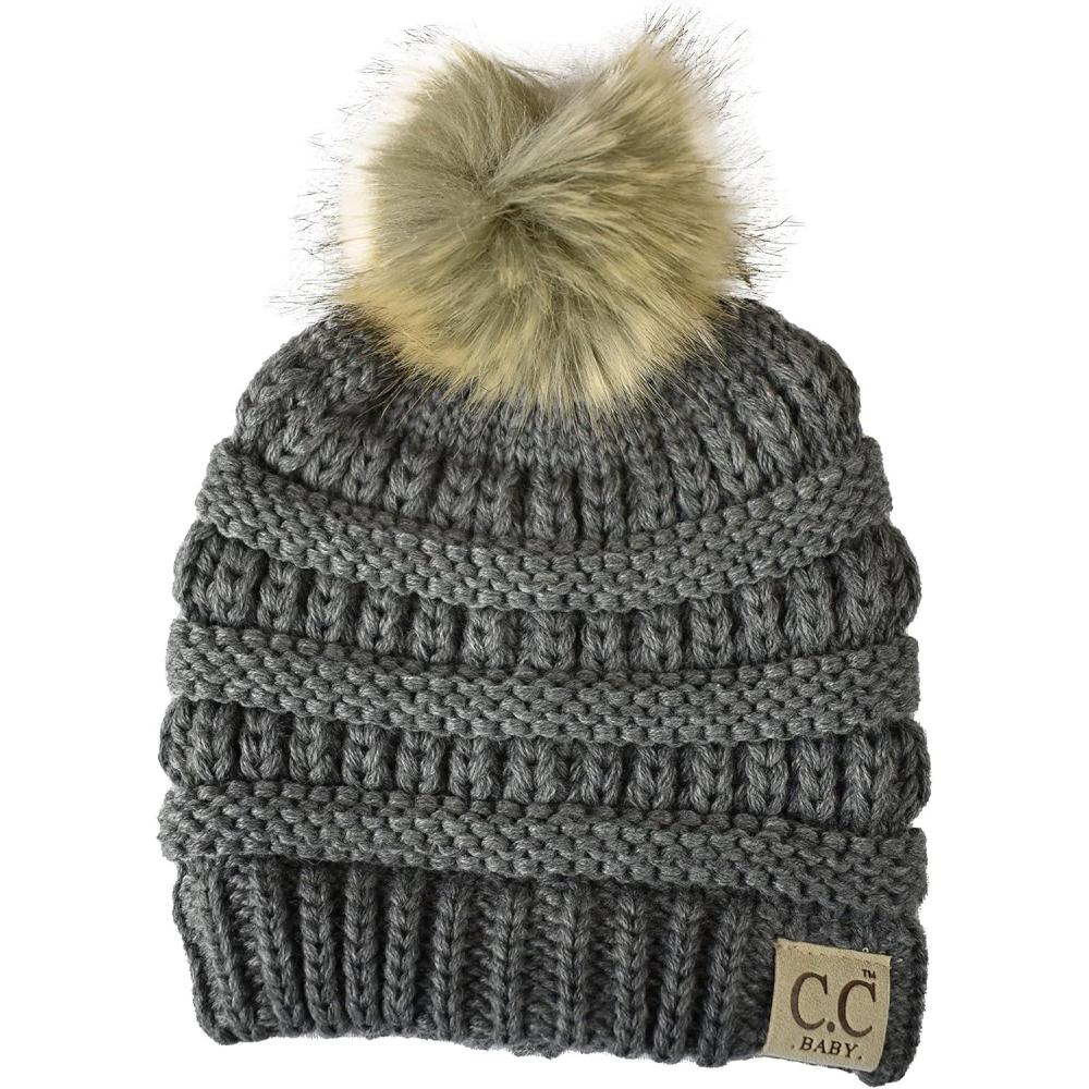 C.C Kids’ Babies’ Soft Stretch Cable Knit Faux Fur Pom Pom Beanie Hat(Light Melange Gray)