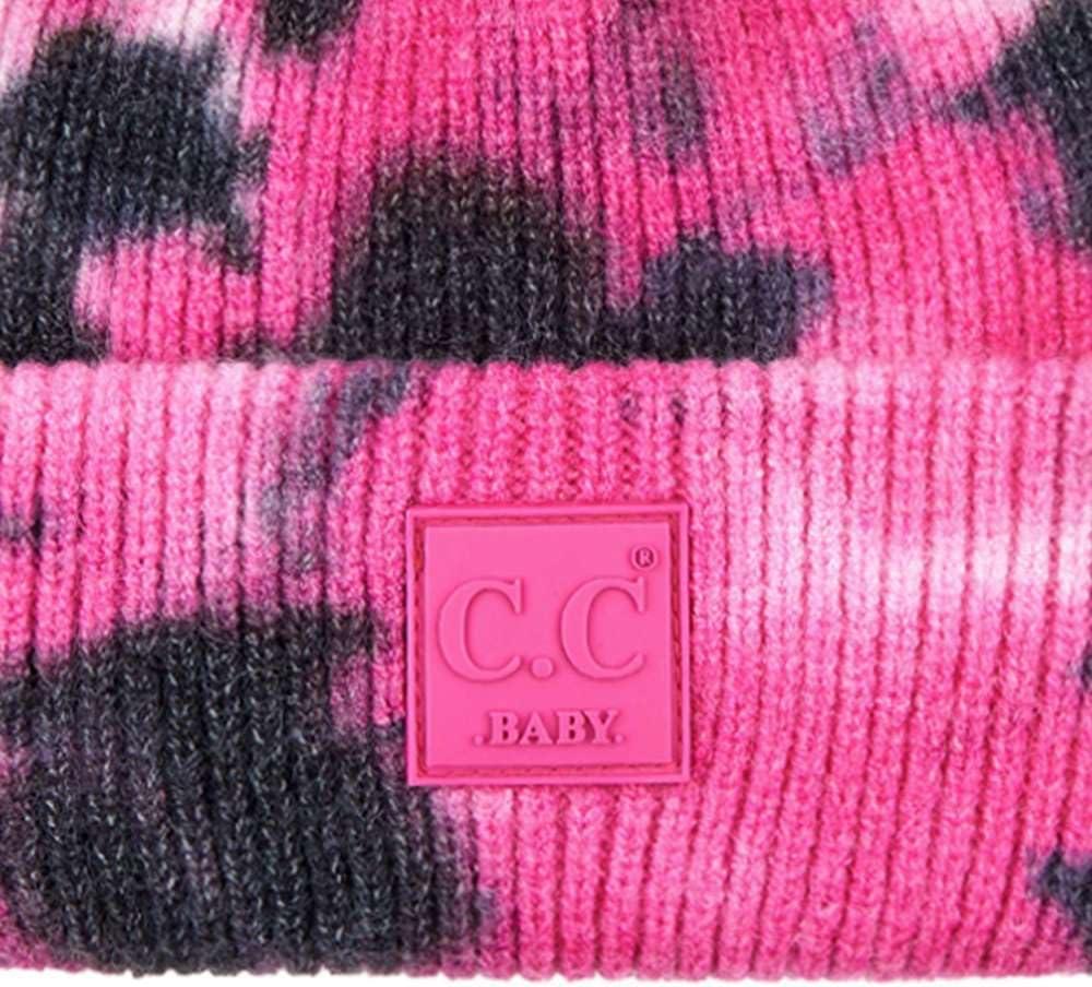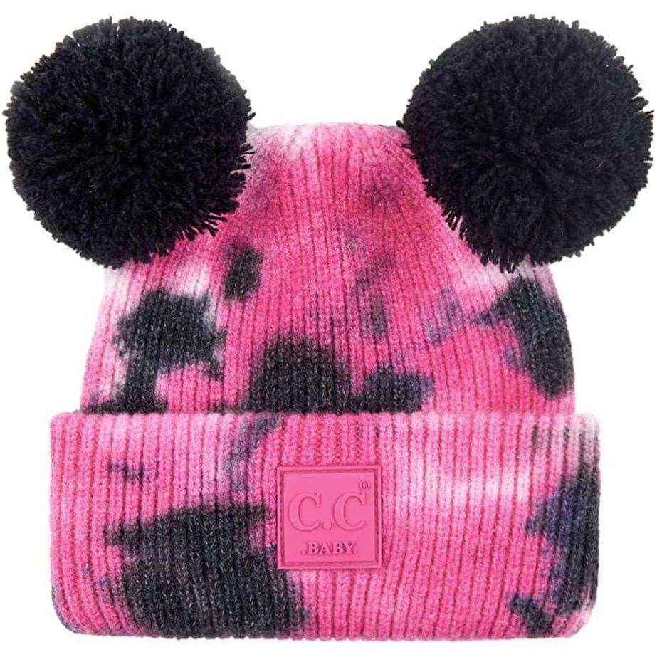 C.C Kids' Babies' Soft Stretch Cable Knit Faux Fur Pom Pom Beanie Hat(Tie Dye Black/Hot Pink)