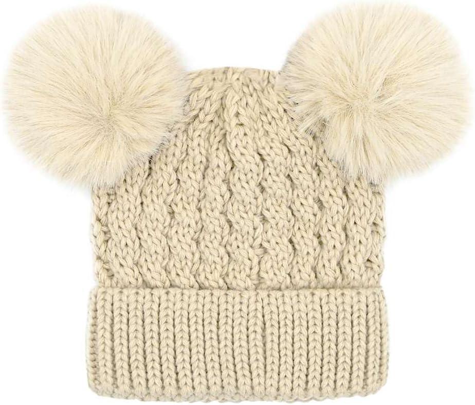 imageCC Kids Cable Knit Double Pom Beanie for Kids  Comfortable Soft Warm Children Youth Skully Hat with PomMatching Faux Fur Pom Beige