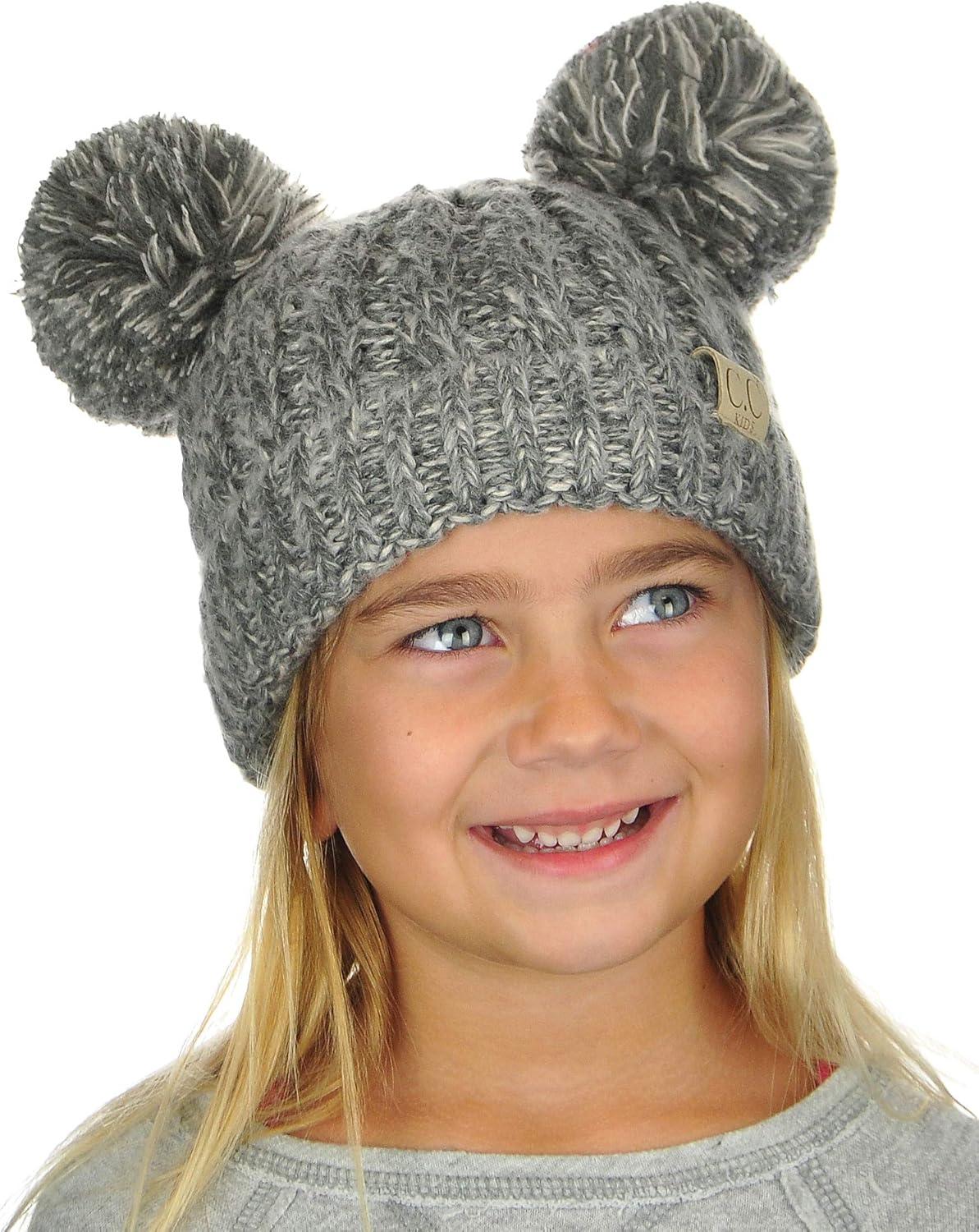 C.C Kids’ Children’s Cable Knit Double Ear Pom Cuffed Beanie Cap Hat(Two Tone Dark Grey)
