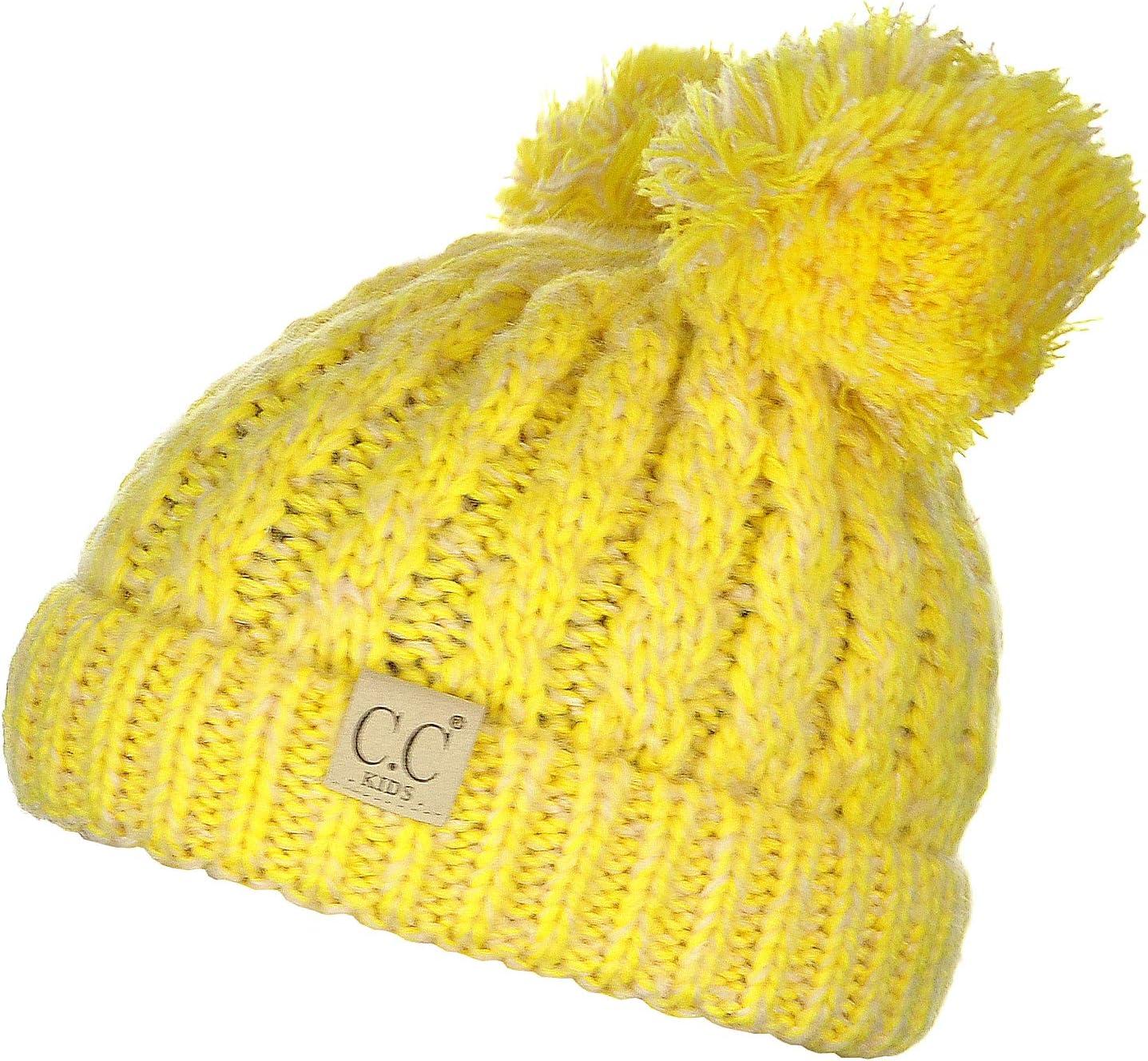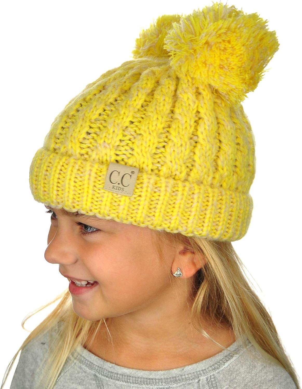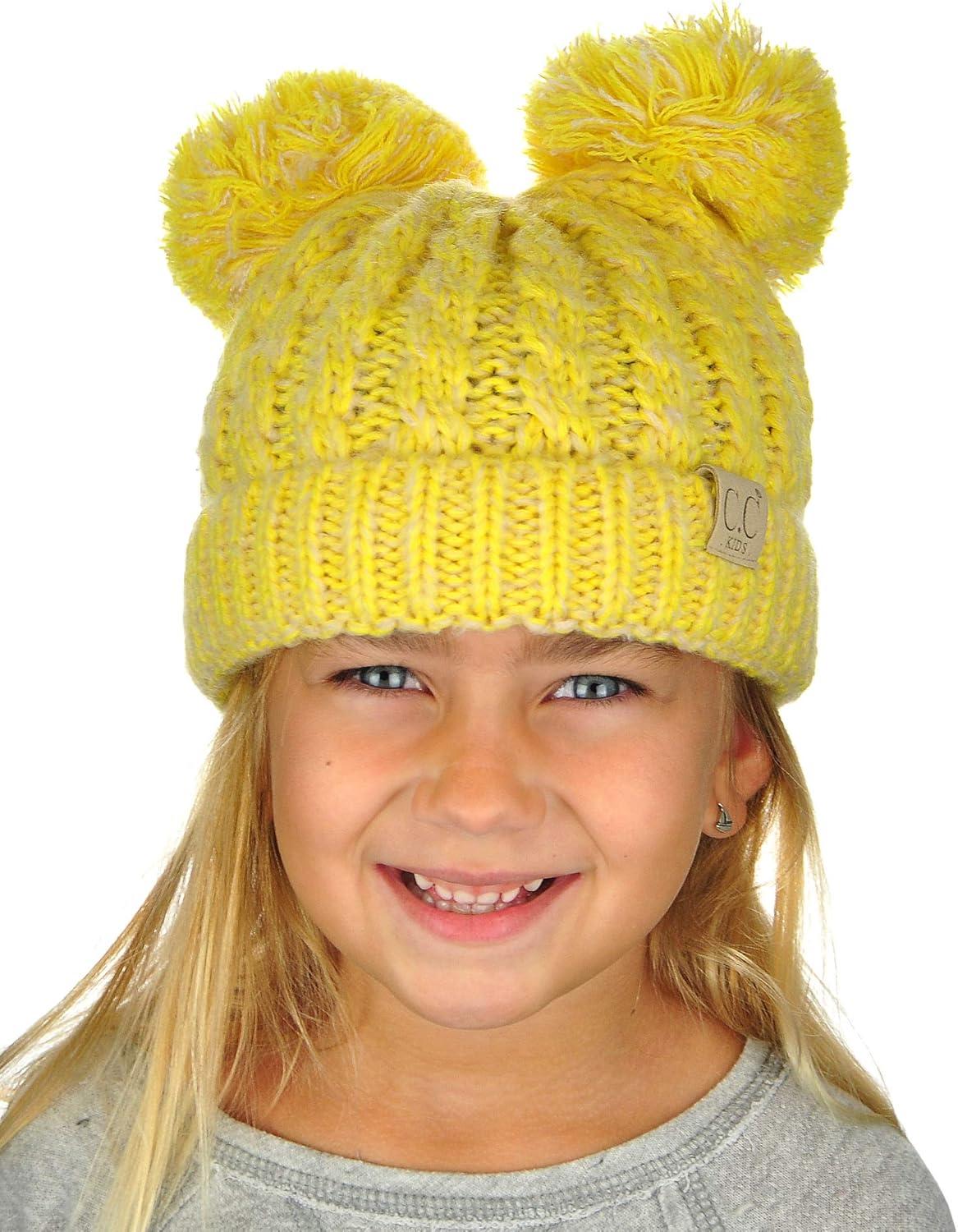 C.C Kids’ Children’s Cable Knit Double Ear Pom Cuffed Beanie Cap Hat(Two Tone Lemon)