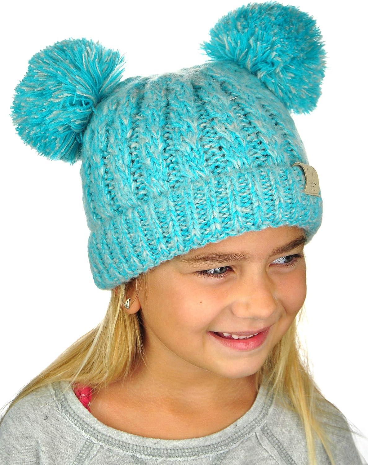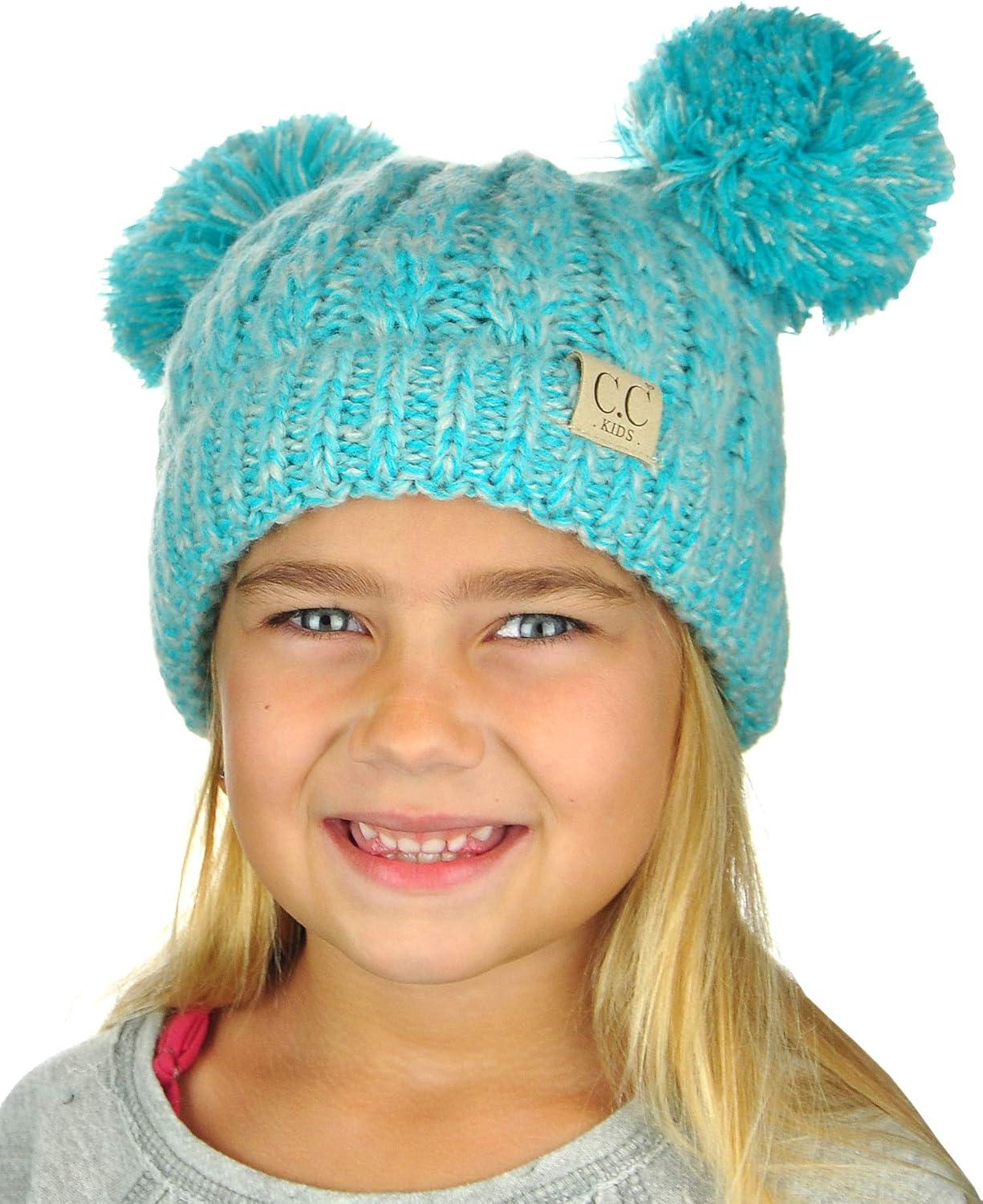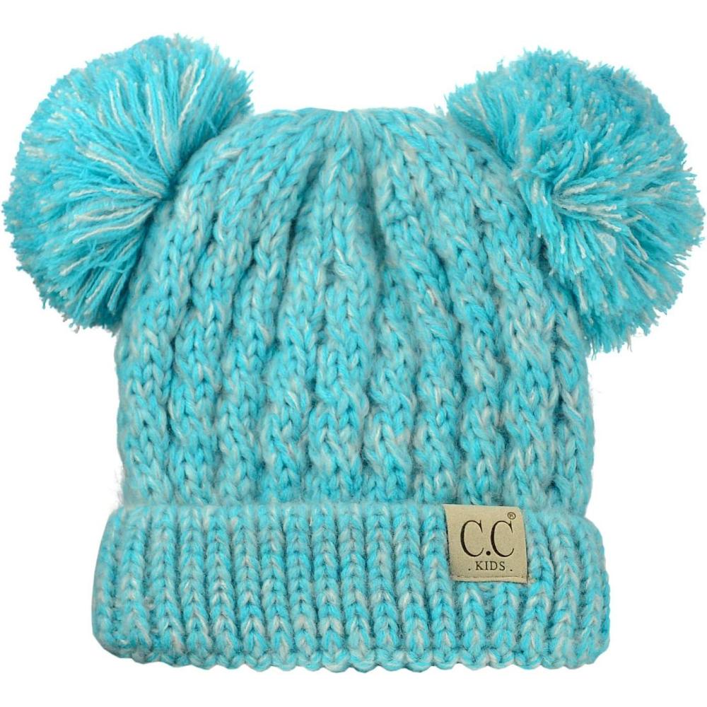 C.C Kids’ Children’s Cable Knit Double Ear Pom Cuffed Beanie Cap Hat(Two Tone Mint)