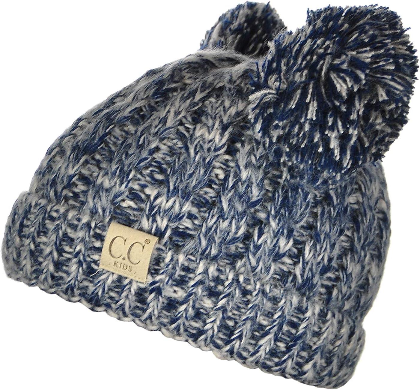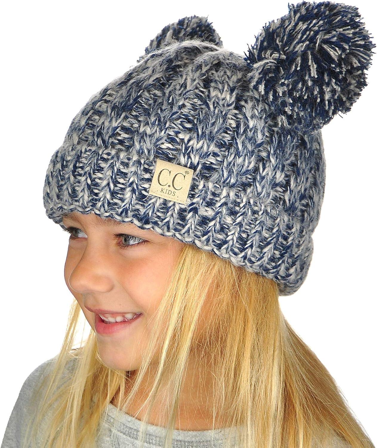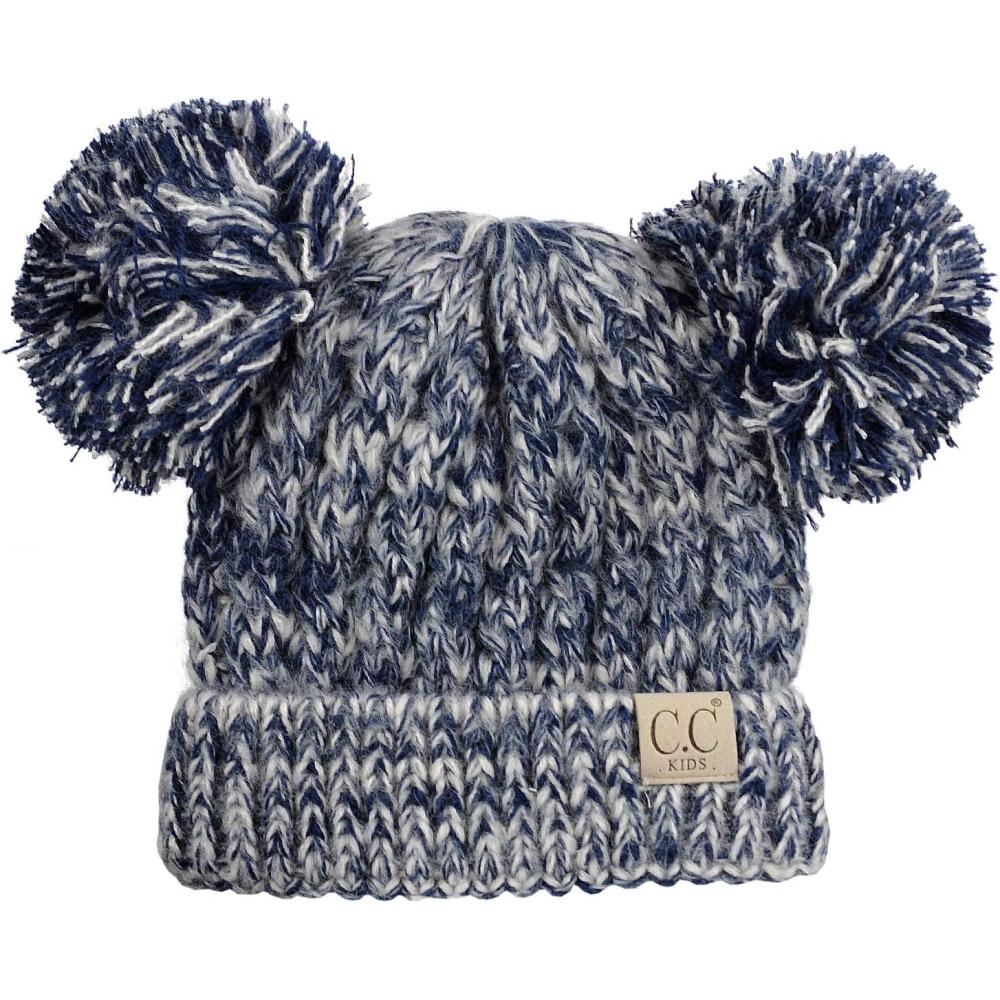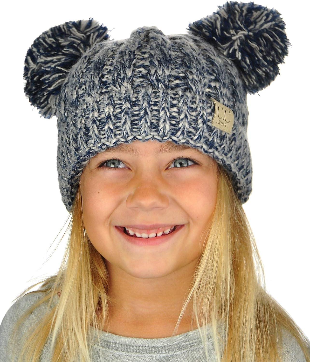 C.C Kids’ Children’s Cable Knit Double Ear Pom Cuffed Beanie Cap Hat(Two Tone Navy)