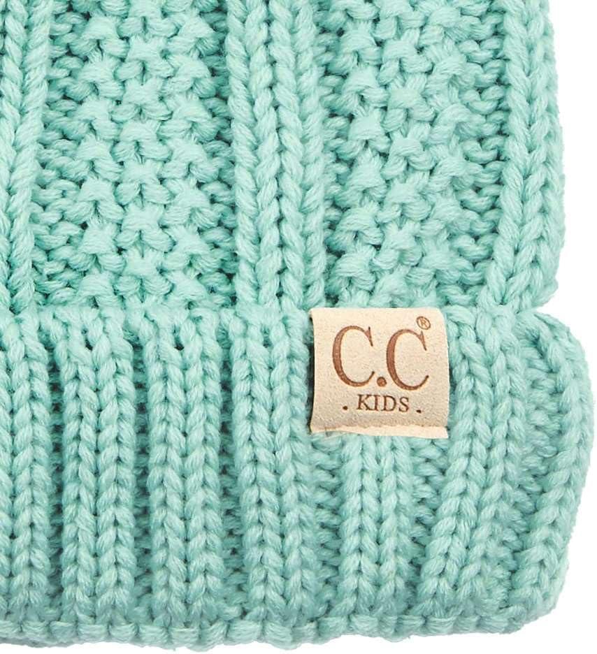 C.C Kids’ Children’s Cable Knit Faux Fuzzy Fur Pom Fleece Lined Cuff Beanie(Mint)
