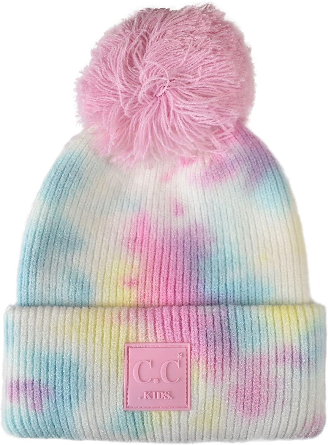 C.C Kids' Children's Winter Thick Knit Tie Dye Pom Cuff Beanie(Cotton Candy)