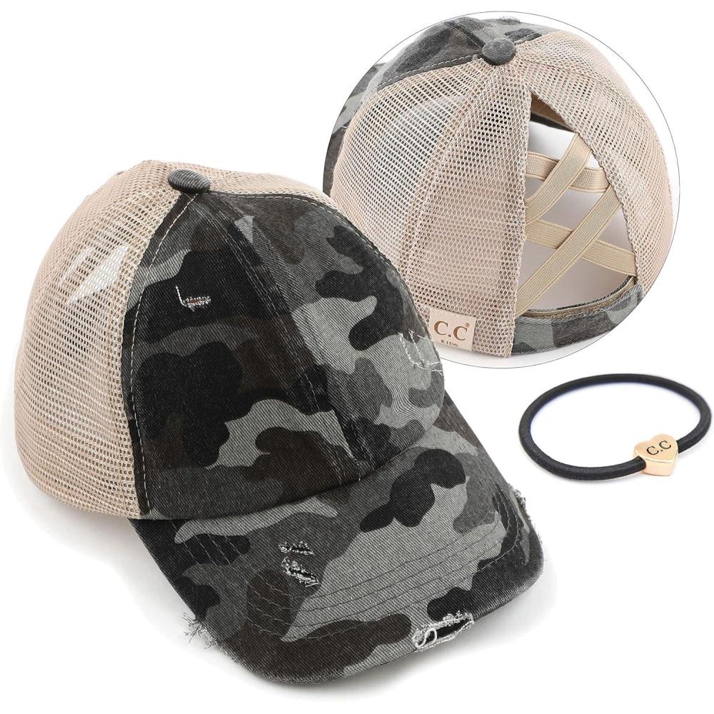 C.C Kids Criss-Cross Elastic Band Ponytail Caps Messy Buns Trucker Plain Baseball Cap (KIDS-BT-780)(Camo-grey)