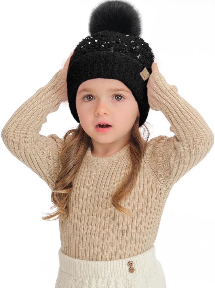 C.C Kids Sequin Fur Pom Beanie for Boys Girls - Comfortable Soft Warm Children Youth Knit Skully Hat with Faux Fur Pom(Black)