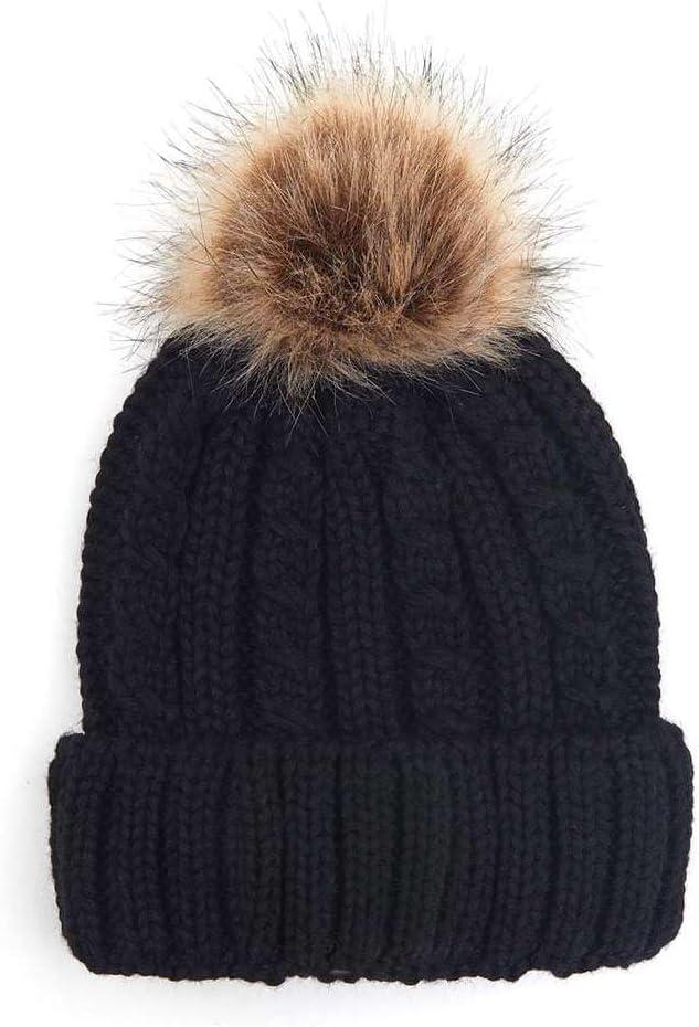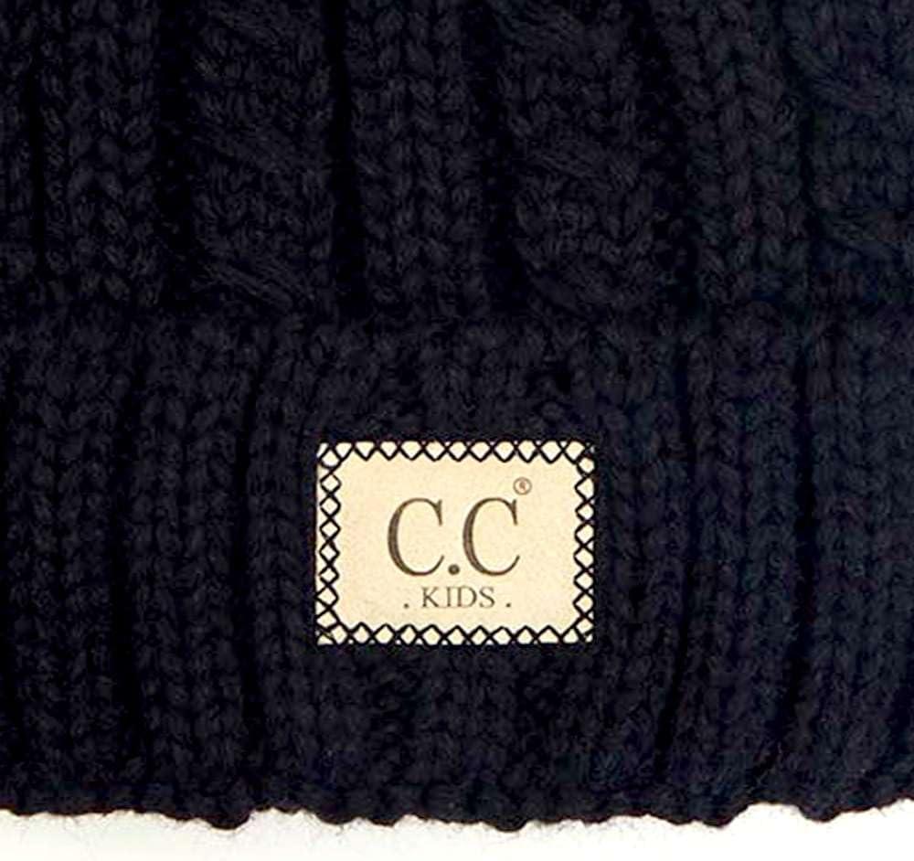 C.C Kids’ Suede Patch Snuggly Soft Warm Knit Pom Cuff Beanie(Cable Knit Faux Fur Black)