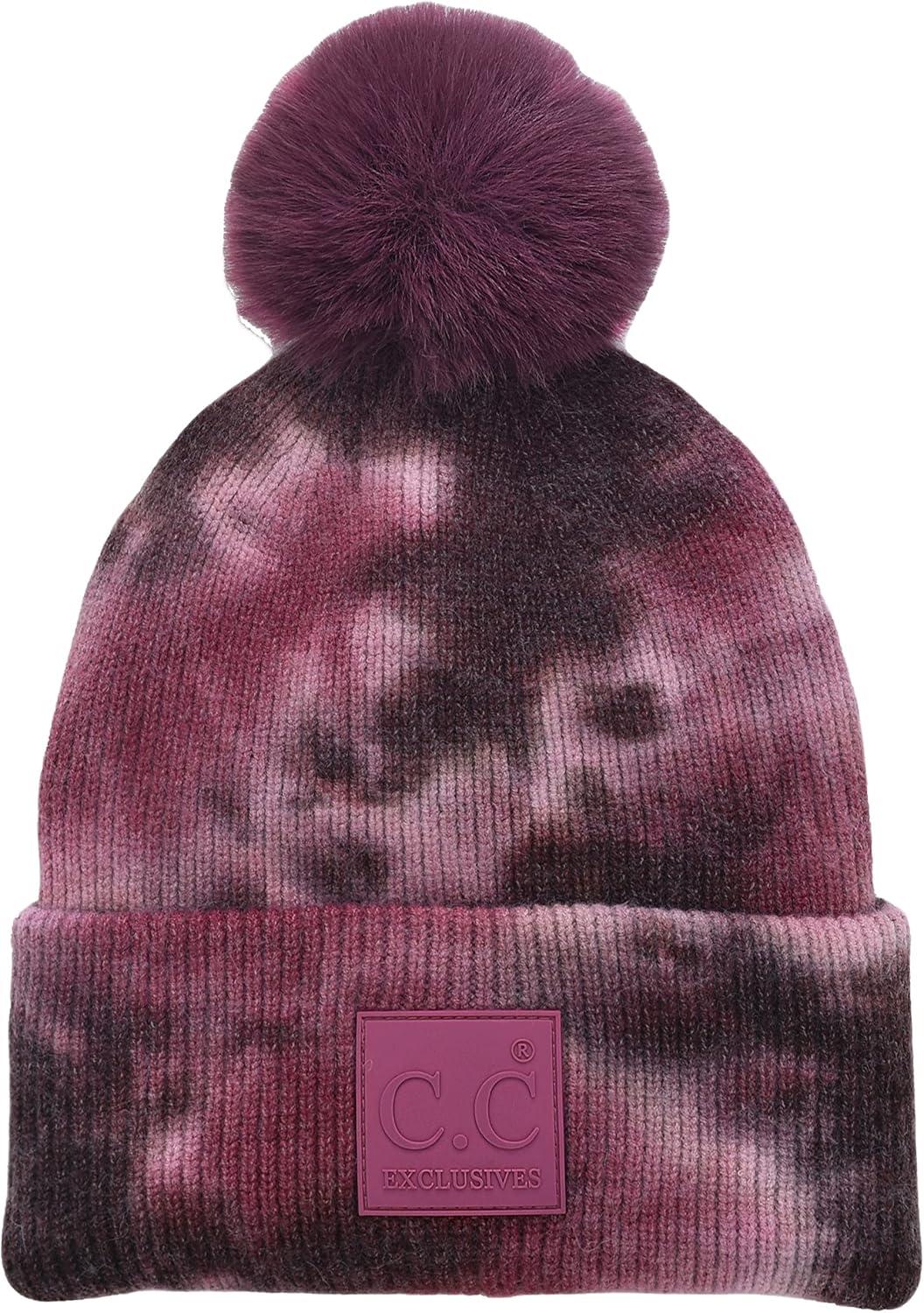 C.C Knit Beanie with 2 Detachable Matching and Natural Poms – Soft Cuffed Winter Hat, Warm Stretchy Skull Cap(Tie Dye Brown / Wild Ginger)