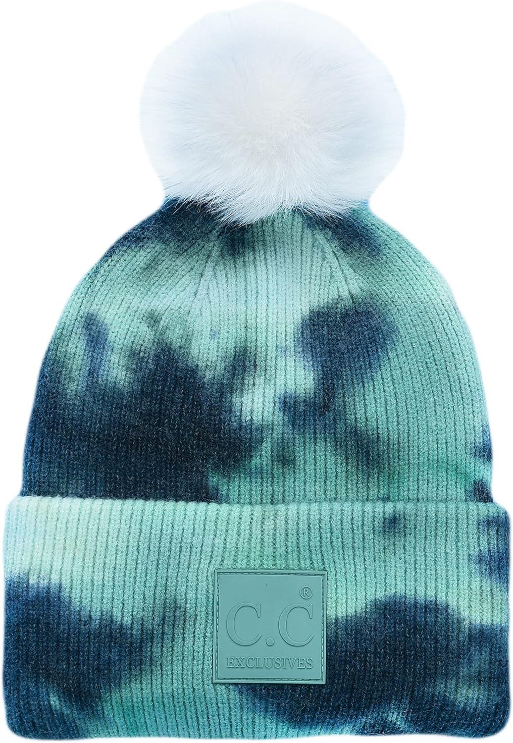 C.C Knit Beanie with 2 Detachable Matching and Natural Poms – Soft Cuffed Winter Hat, Warm Stretchy Skull Cap(Tie Dye Deep Teal / Sea Green)