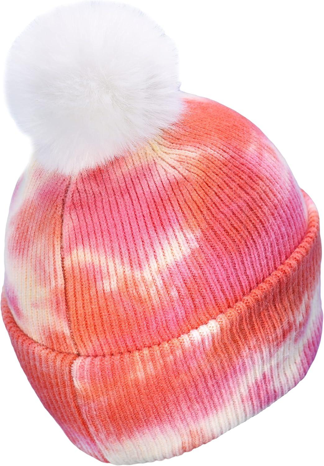 C.C Knit Beanie with 2 Detachable Matching and Natural Poms – Soft Cuffed Winter Hat, Warm Stretchy Skull Cap(Tie Dye Orange / Peach)