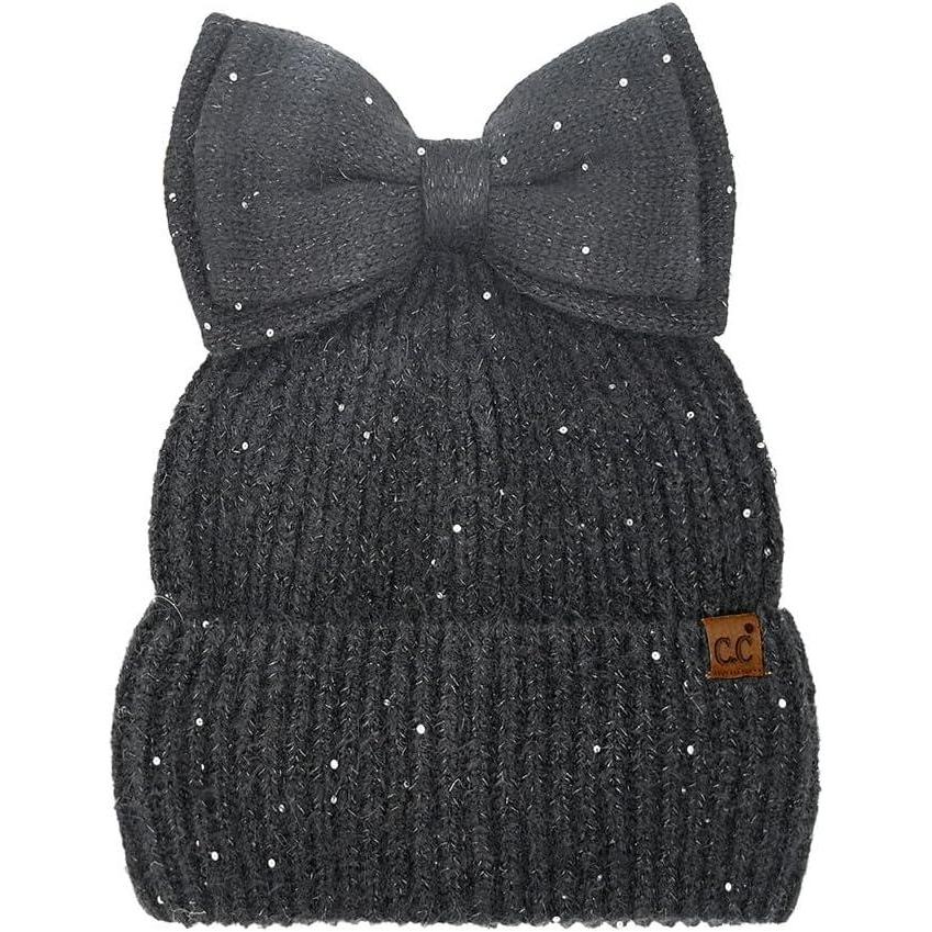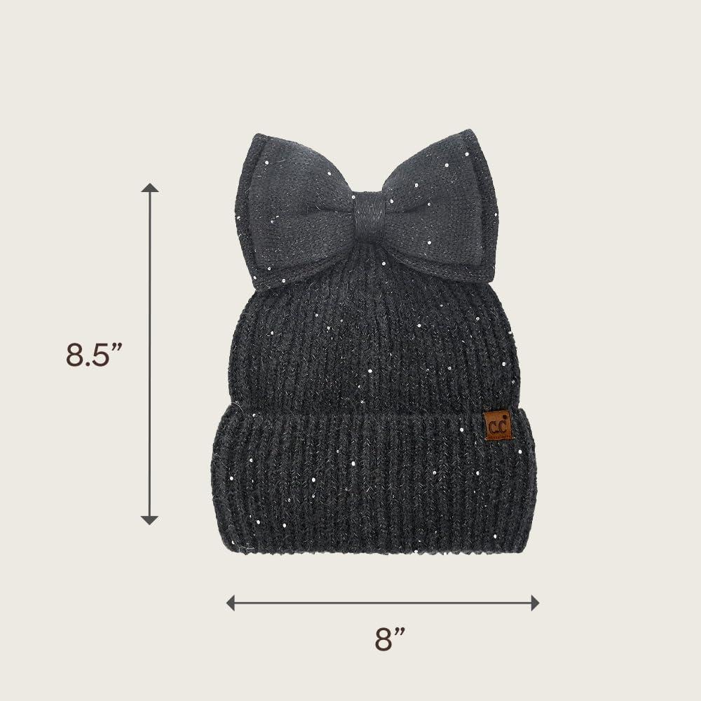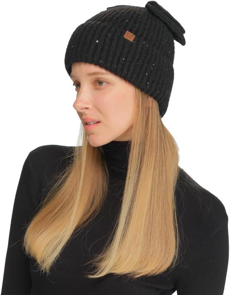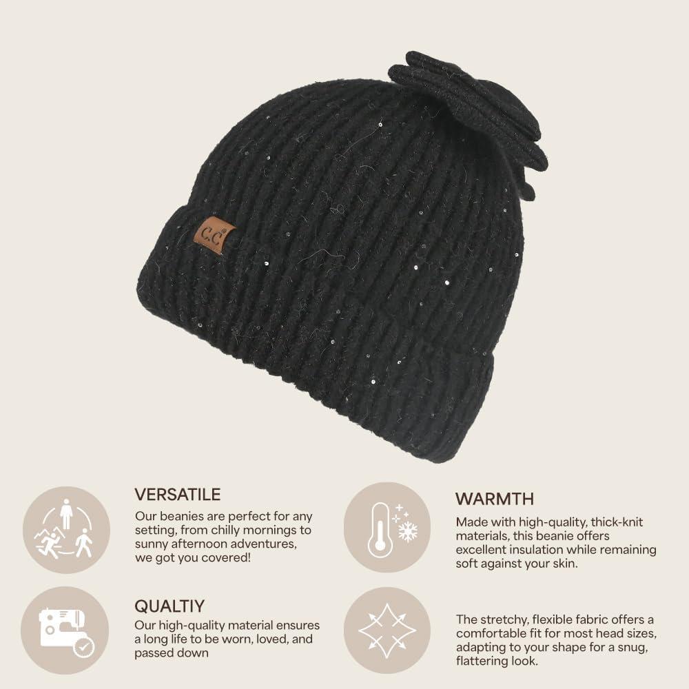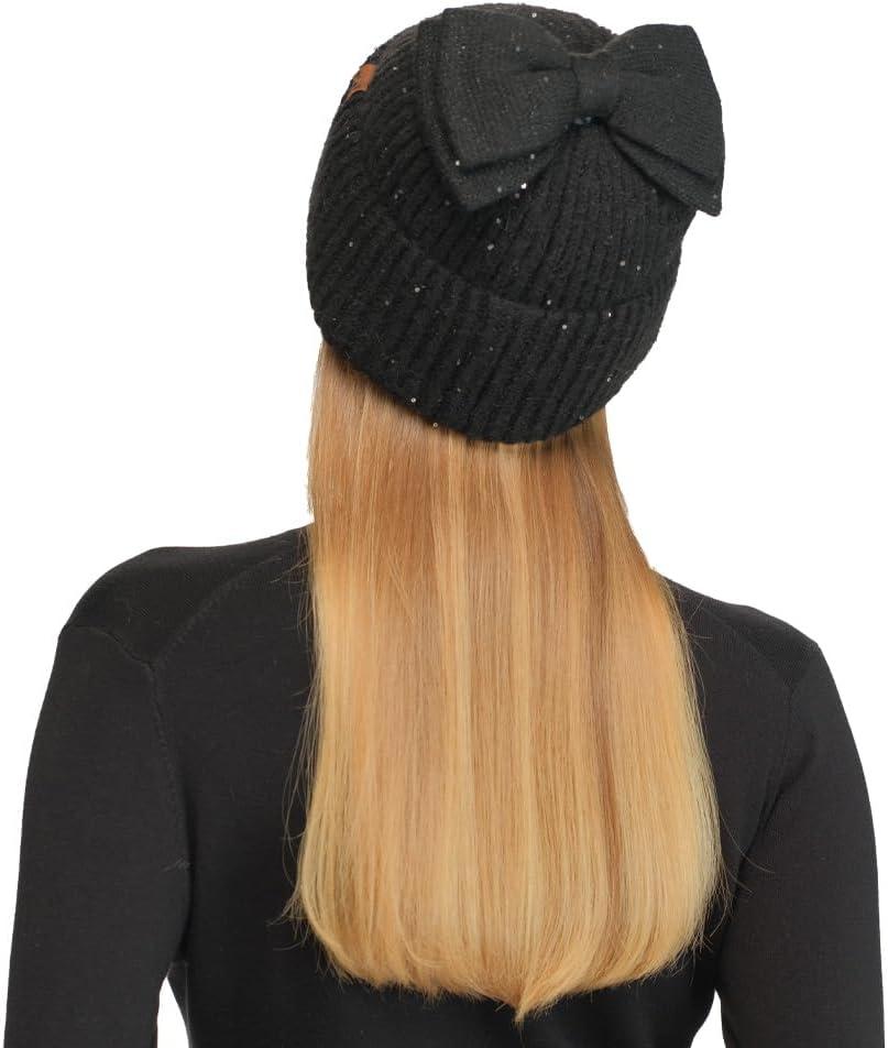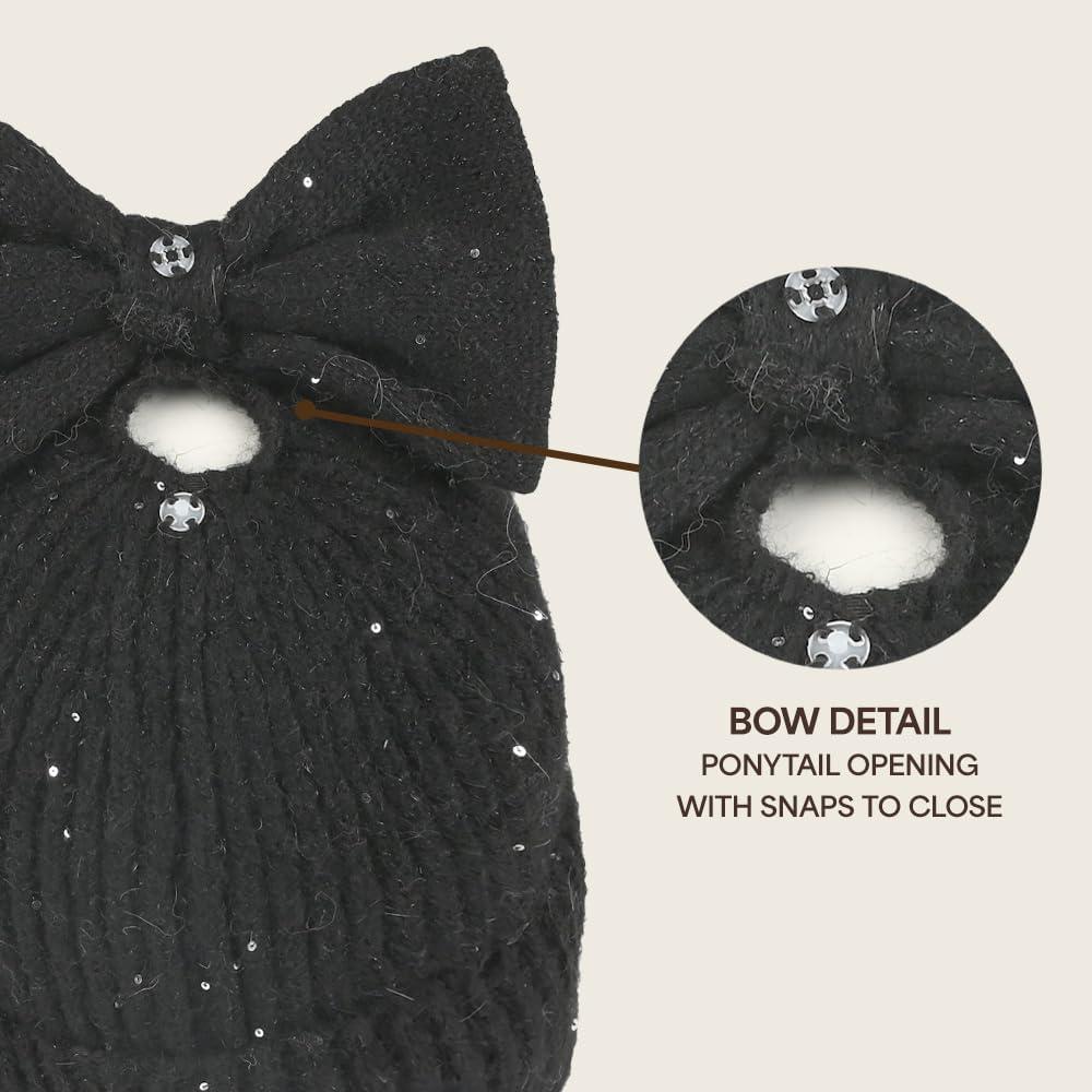 C.C Messy Bun Snap-On Bow Beanie with Sequins for Women(Black)