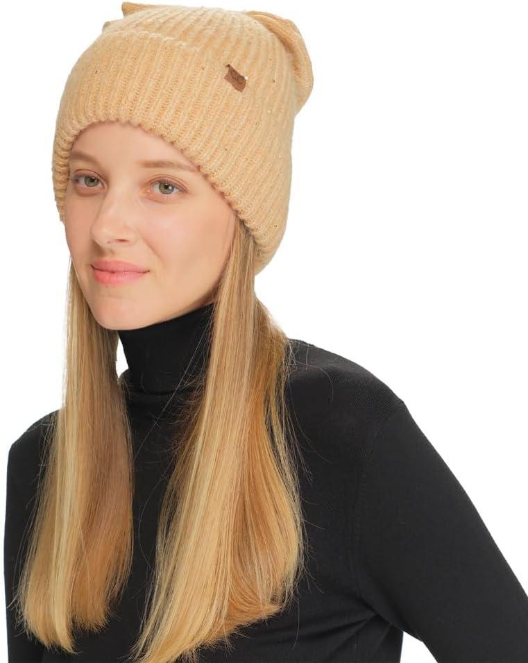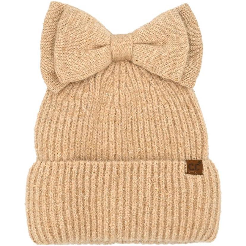 C.C Messy Bun Snap-On Bow Beanie with Sequins for Women(Camel)