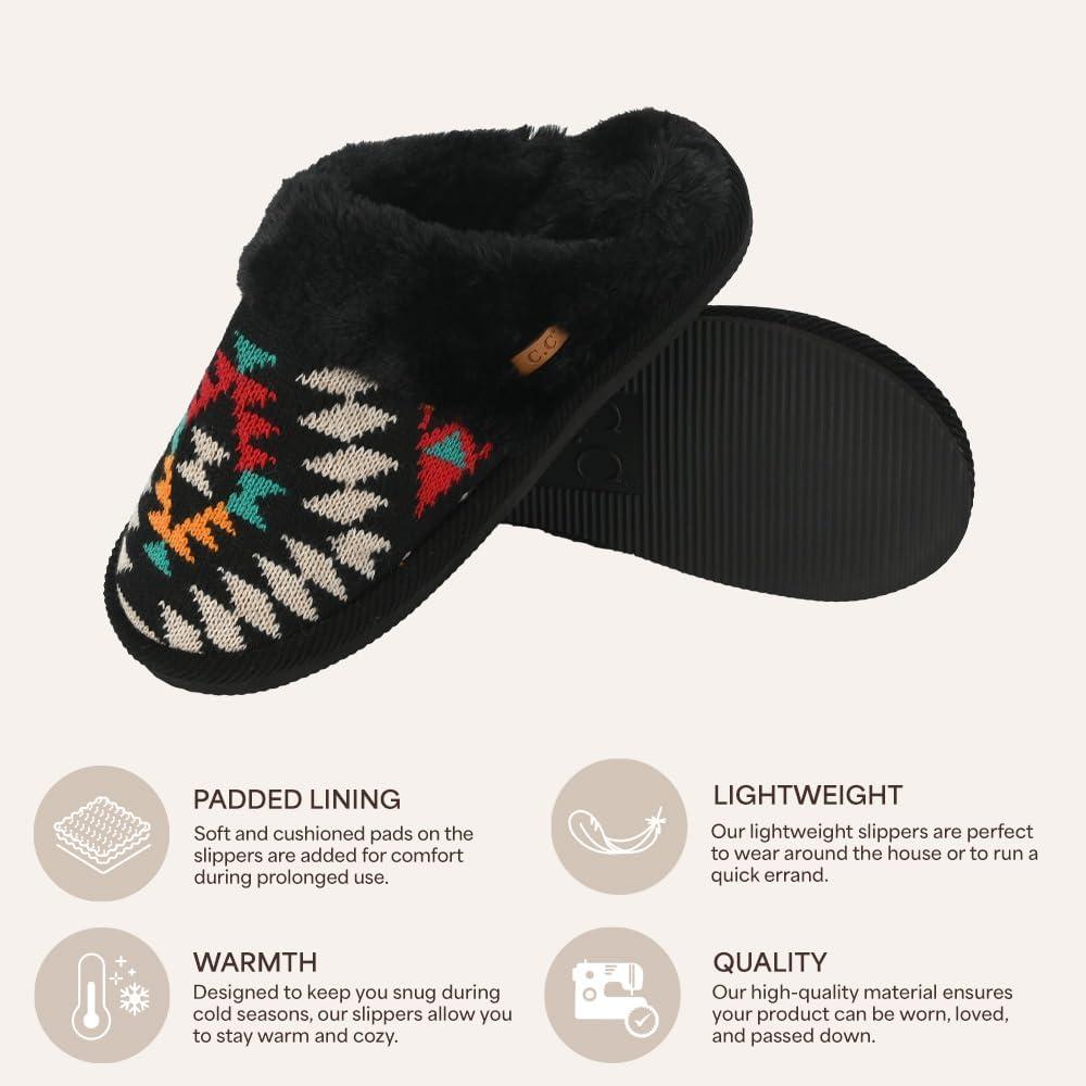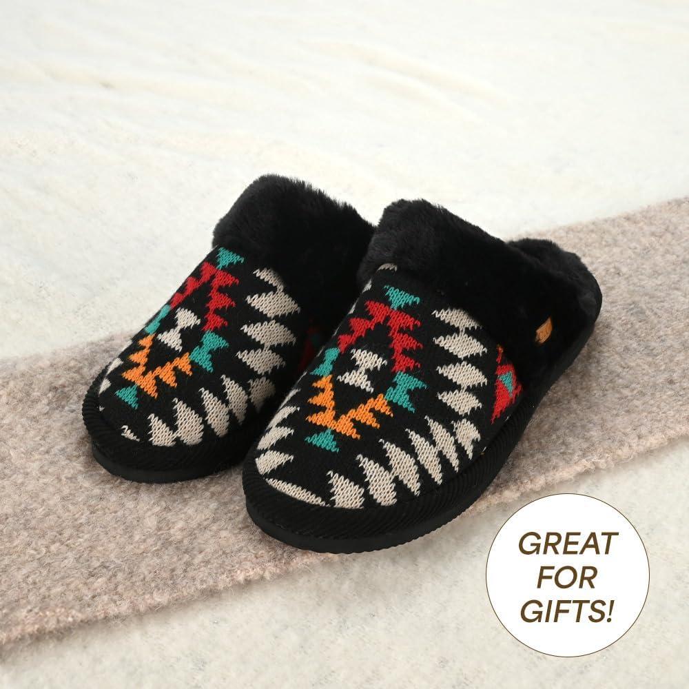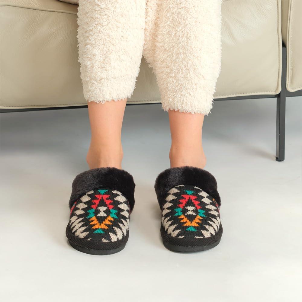 C.C Multi-Option Colorful Slip-On Slippers With Faux Fur Lining Indoor-Outdoor House For Women(Knitted Aztec Pattern – Black)