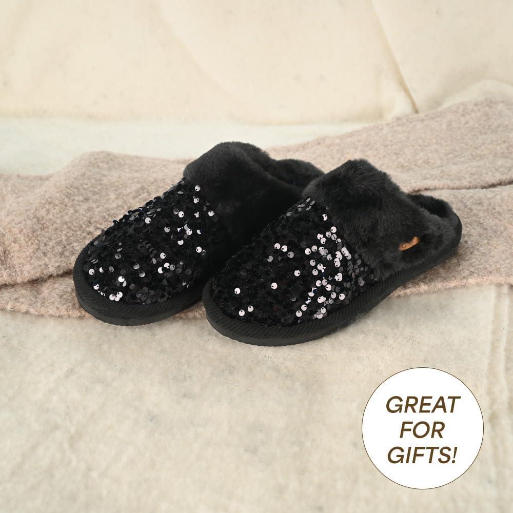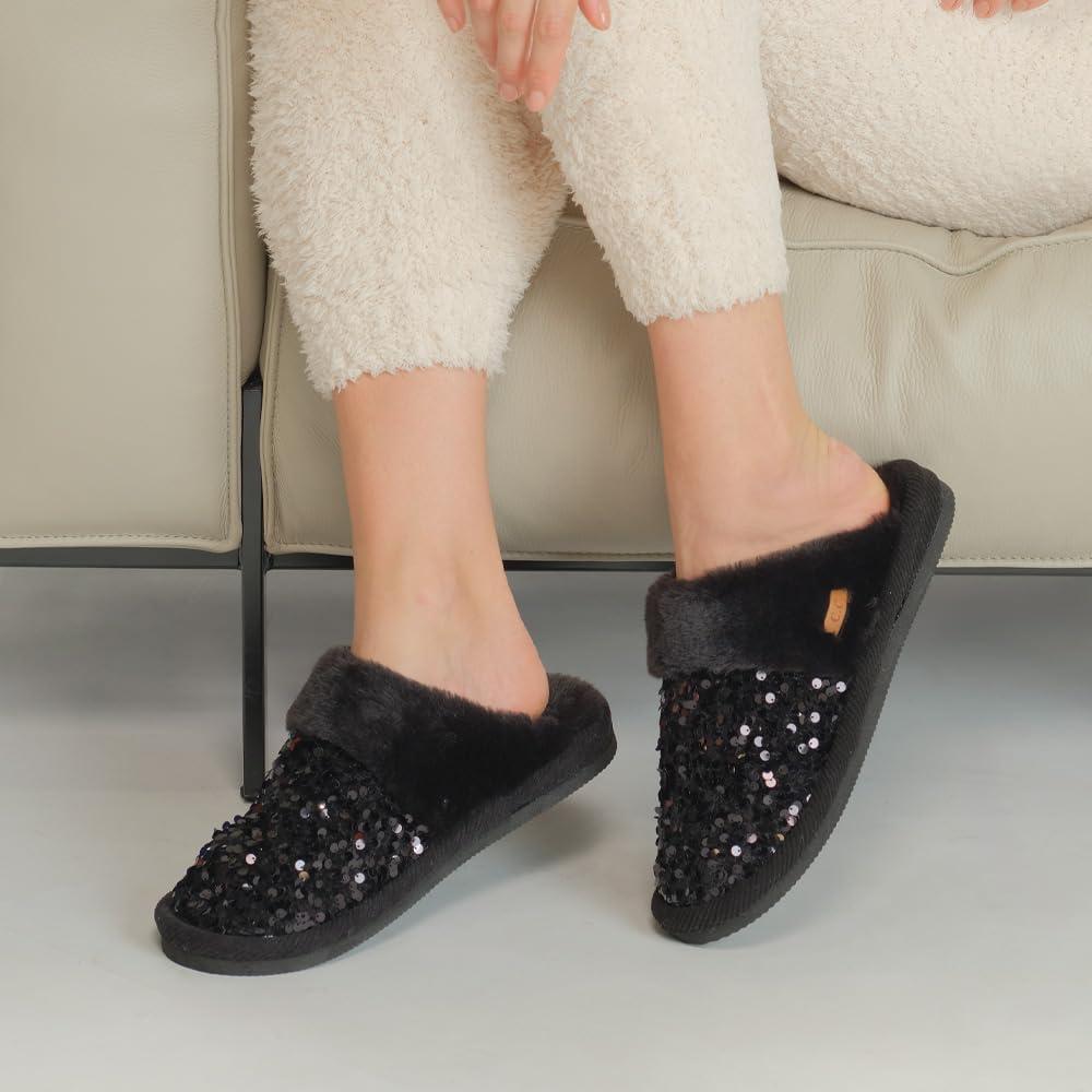 C.C Multi-Option Colorful Slip-On Slippers With Faux Fur Lining Indoor-Outdoor House For Women(Sequin – Black)