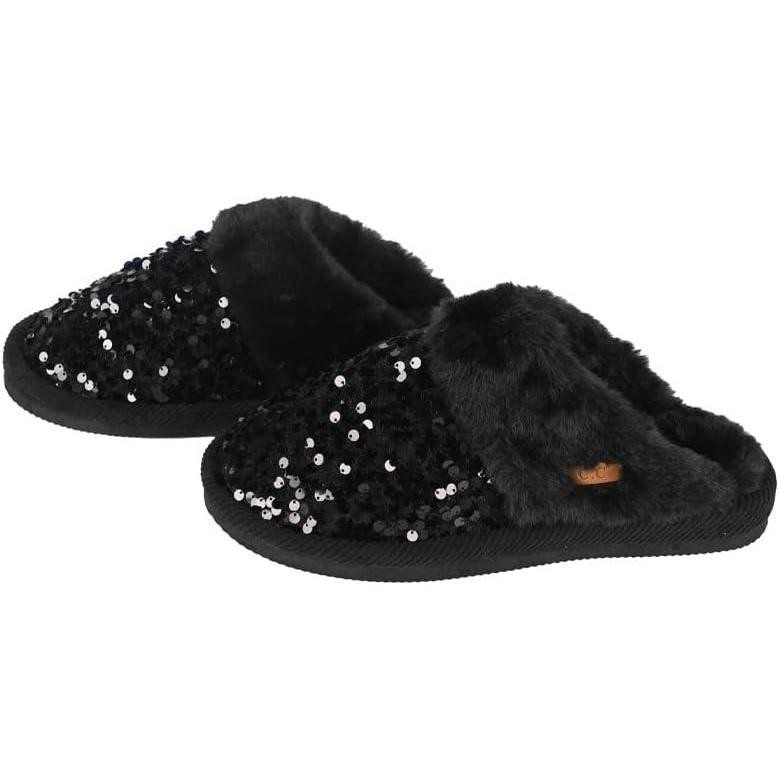 C.C Multi-Option Colorful Slip-On Slippers With Faux Fur Lining Indoor-Outdoor House For Women(Sequin - Black)
