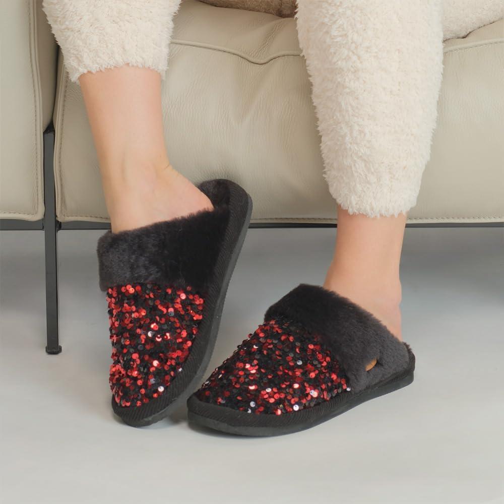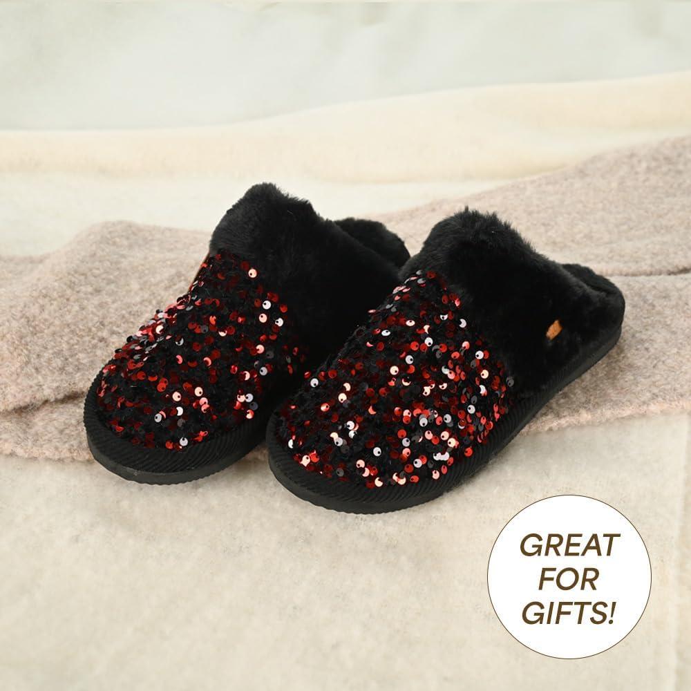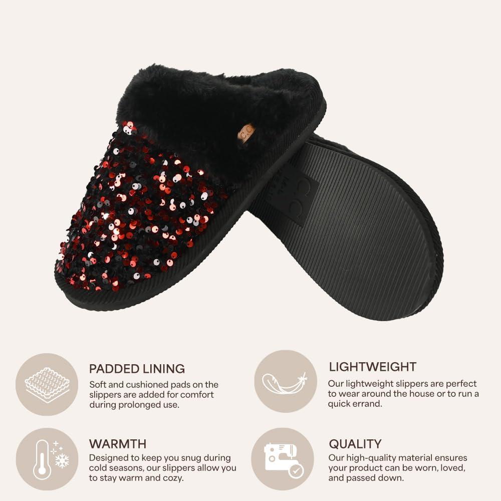 C.C Multi-Option Colorful Slip-On Slippers With Faux Fur Lining Indoor-Outdoor House For Women(Sequin – Red/Black)
