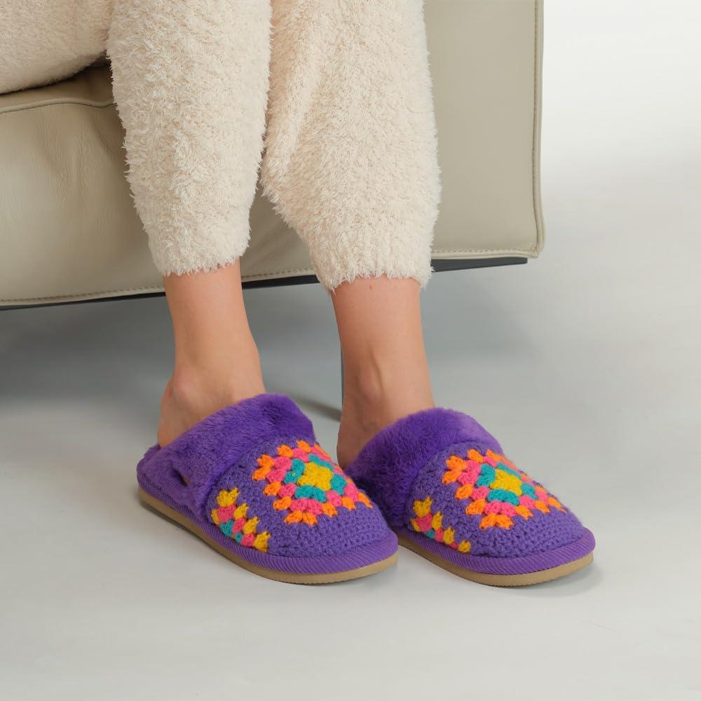 C.C Pattern Knitted Slip-On Slippers With Faux Fur Lining Indoor-Outdoor House For Women(Crochet Purple)