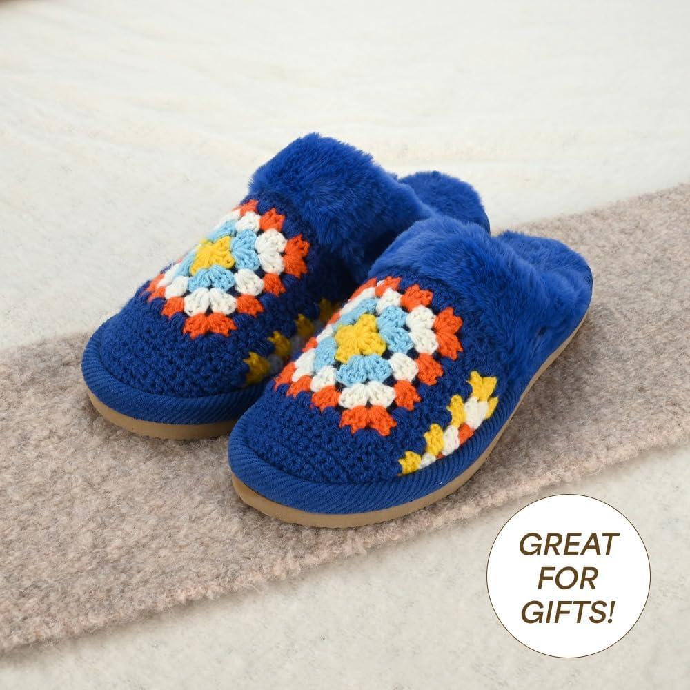 C.C Pattern Knitted Slip-On Slippers With Faux Fur Lining Indoor-Outdoor House For Women(Crochet Royal)