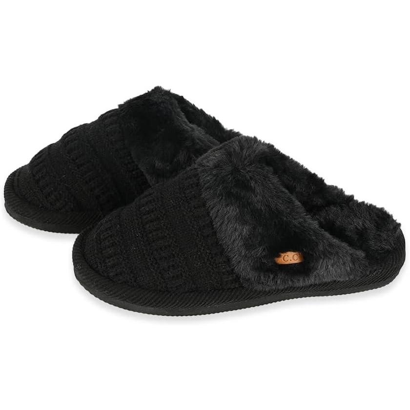 C.C Pattern Knitted Slip-On Slippers With Faux Fur Lining Indoor-Outdoor House For Women(Rib Black)