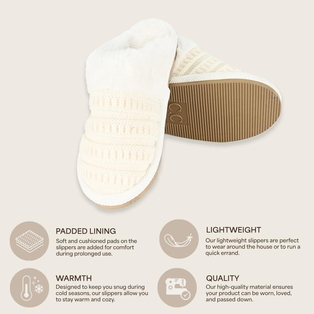 C.C Pattern Knitted Slip-On Slippers With Faux Fur Lining Indoor-Outdoor House For Women(Rib Ivory)